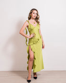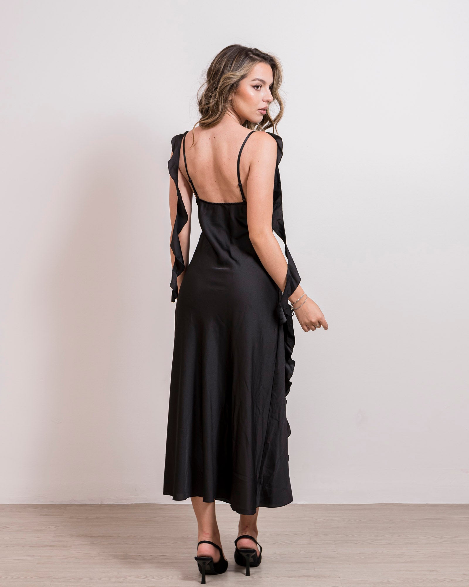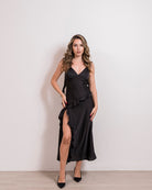 In simil satin effetto raso, bretelline regolabili. Retro con bordo elasticizzato internamente, spacco profondo sul lato. Vestibilità consigliata 38-44