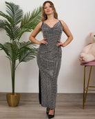Abito con parte anteriore interamente di strass, retro in tessuto elasticizzato.