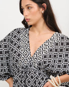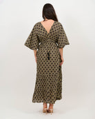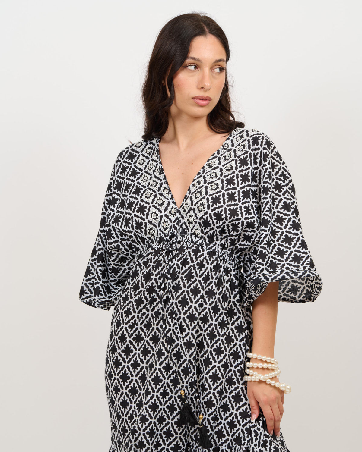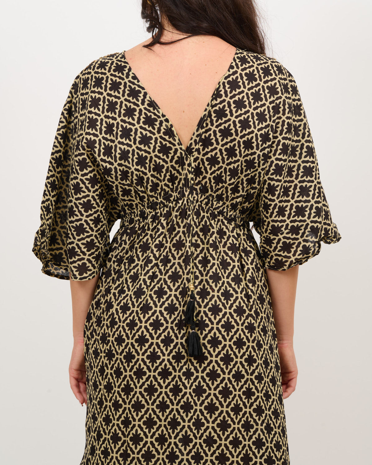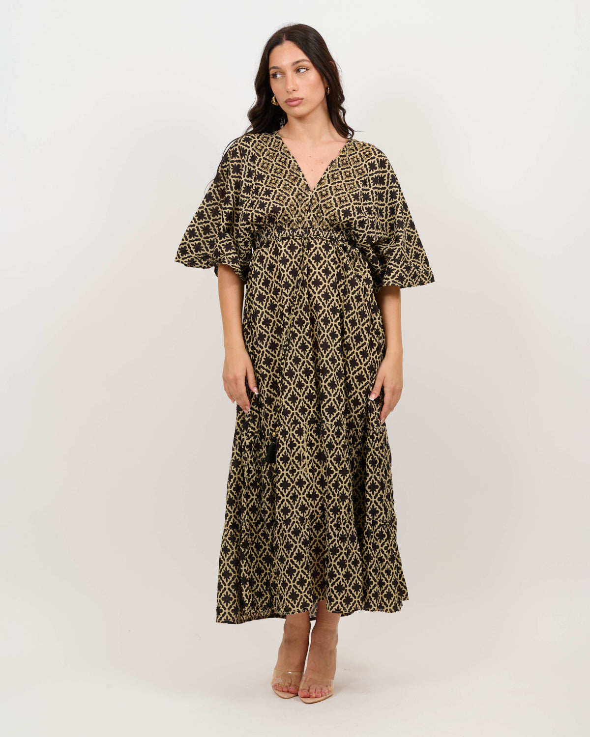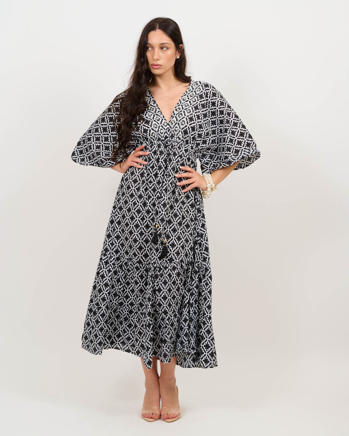 Abito fantasia con scollo a V con pietrine e lustrini, laccio in vita con nappine che regolano larghezza dell'abito e profondità dello scollo.