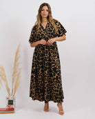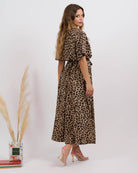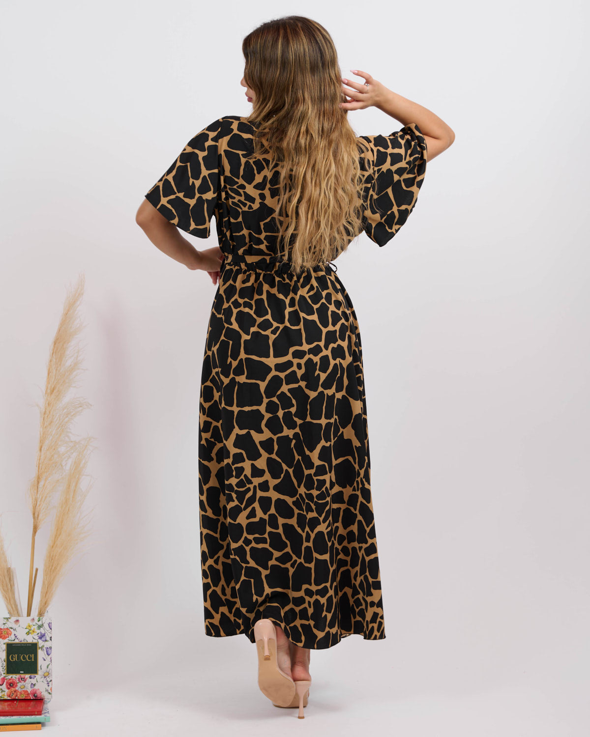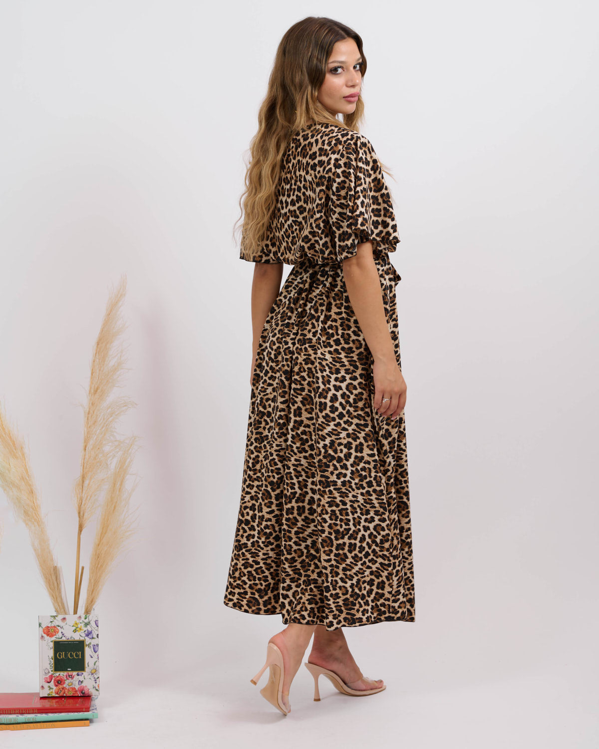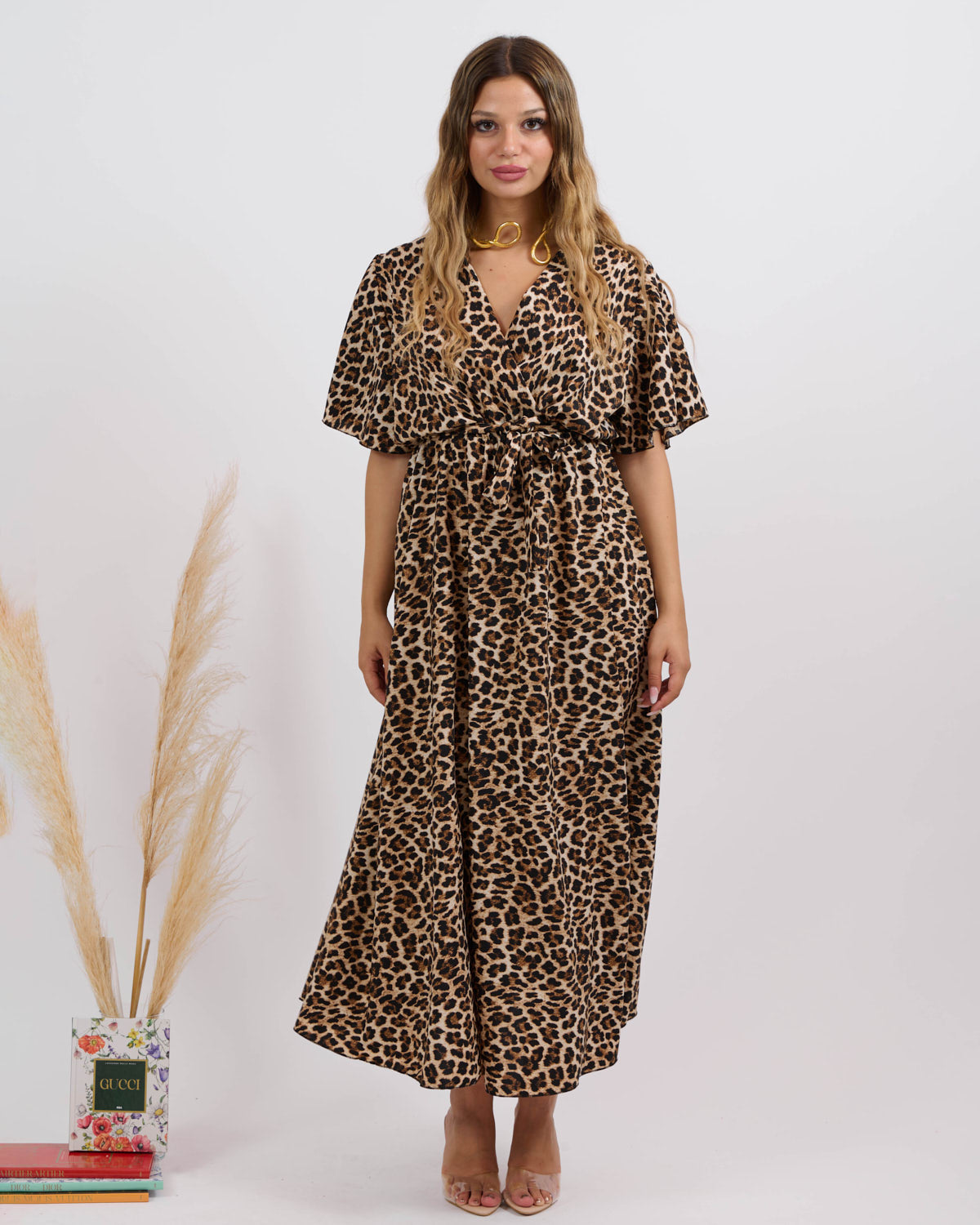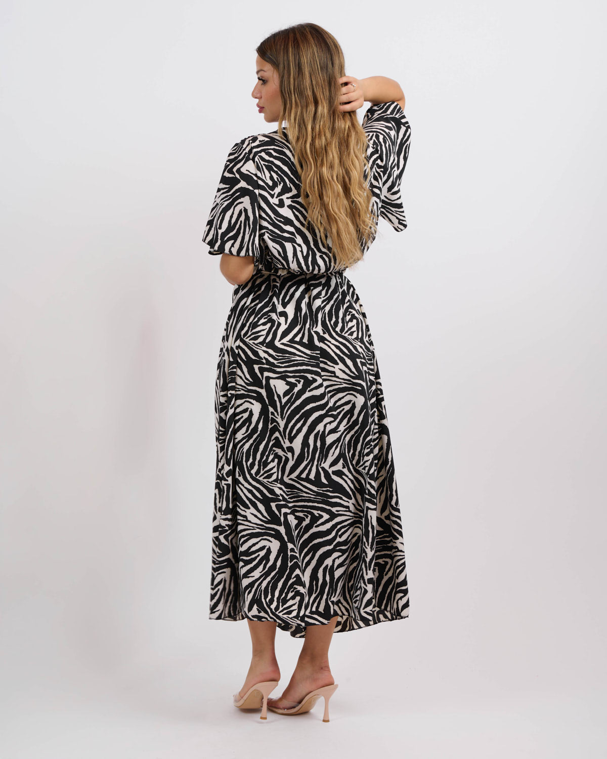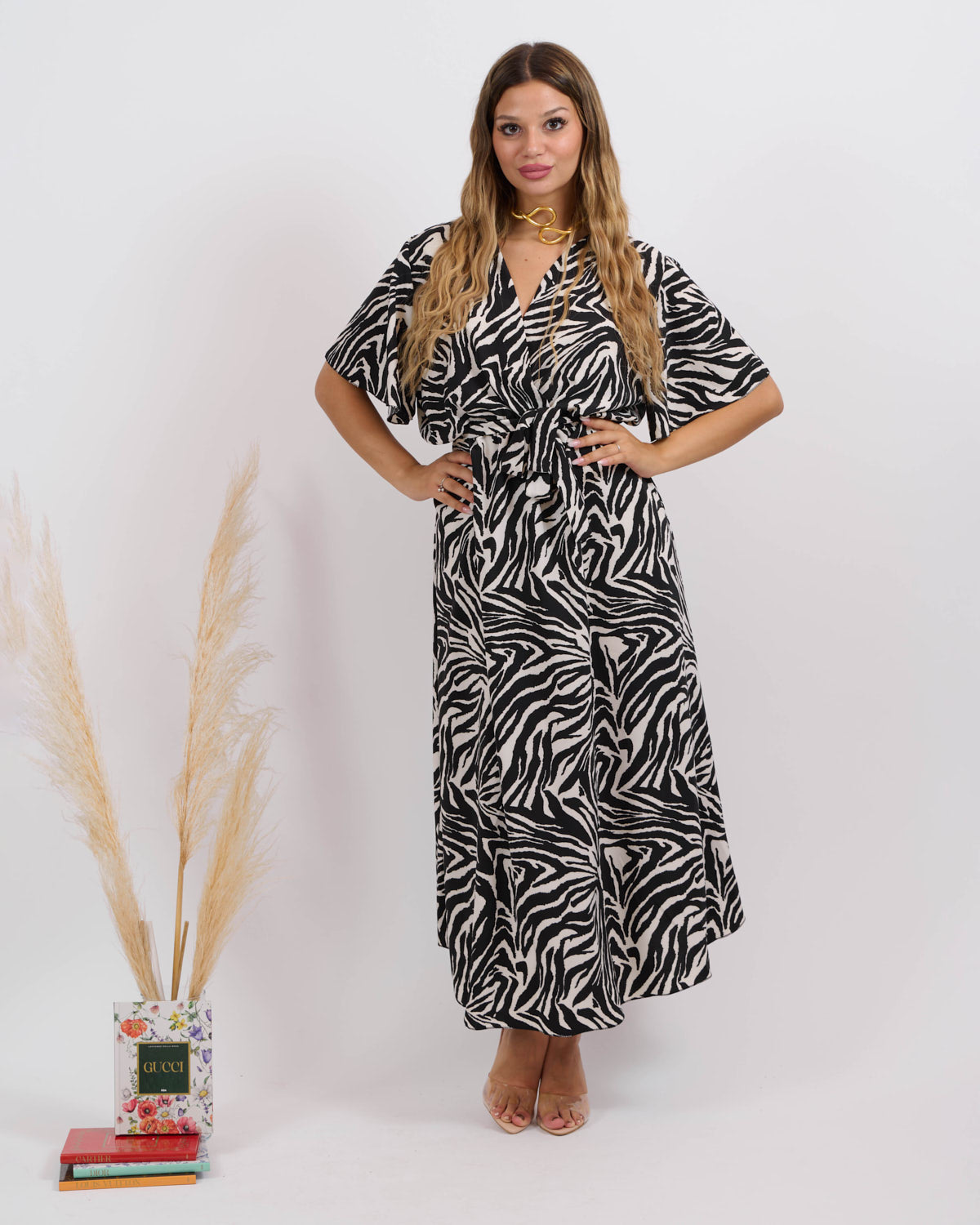 Abito con scolla di incrocio, elastico in vita con cintura in tono. Manica morbida a campana. In taglia unica, veste fino a 50