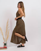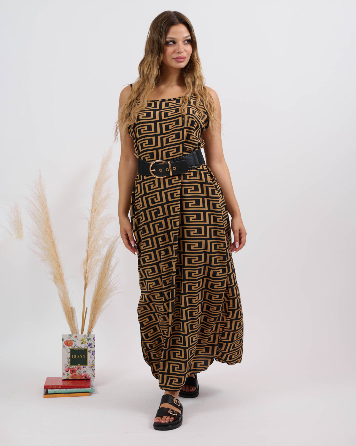 Abito stampato con bretelline, retro elasticizzato con spacco laterale. In taglia unica veste fino a LXL.