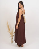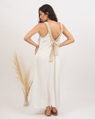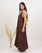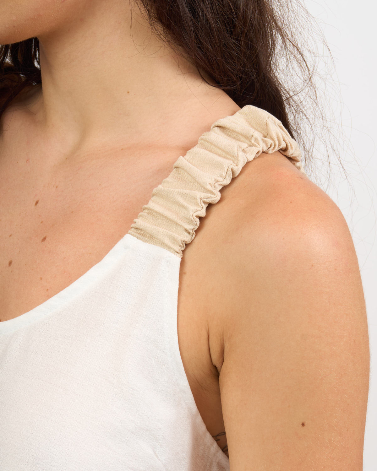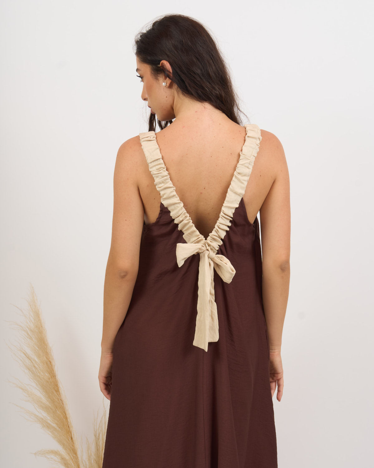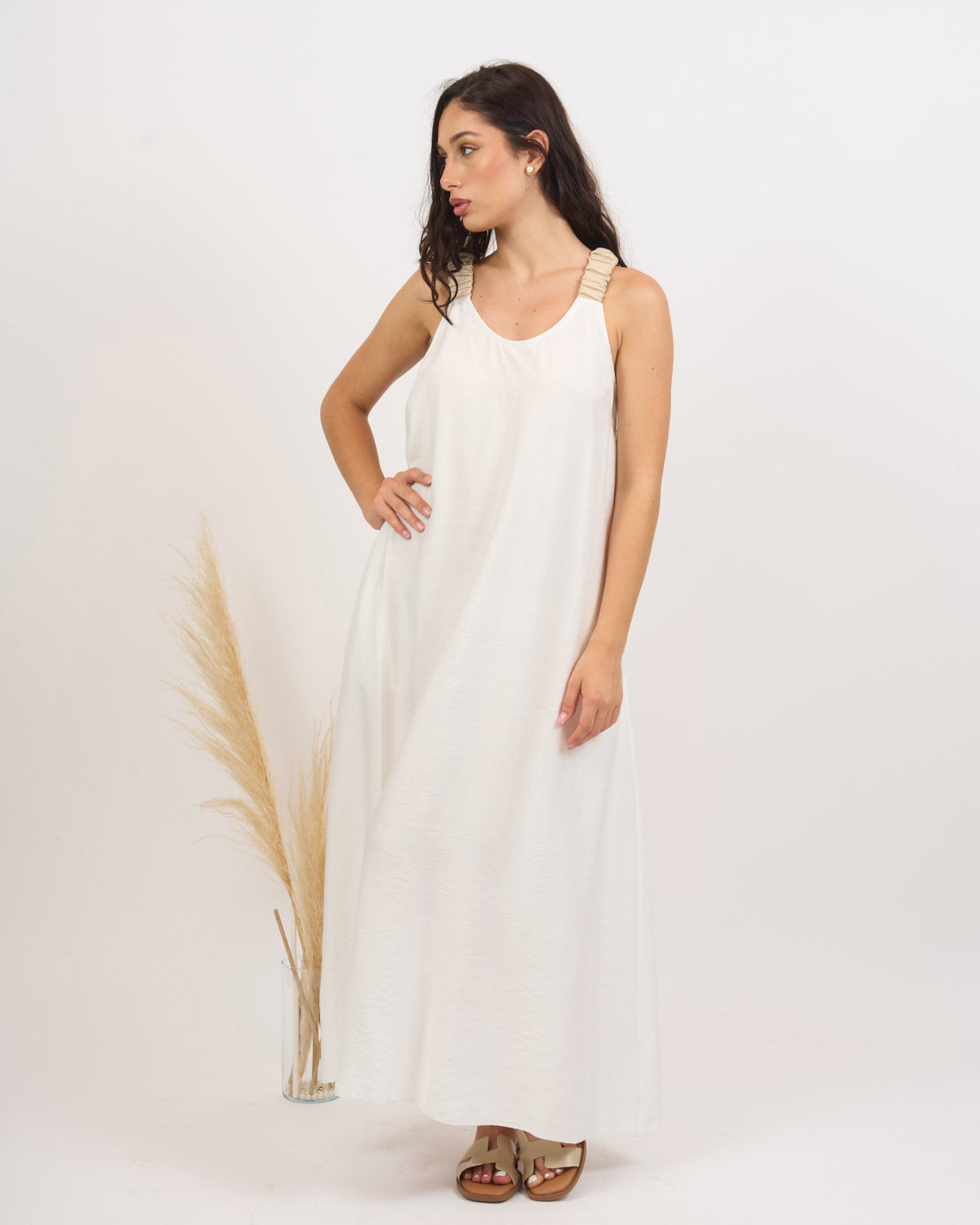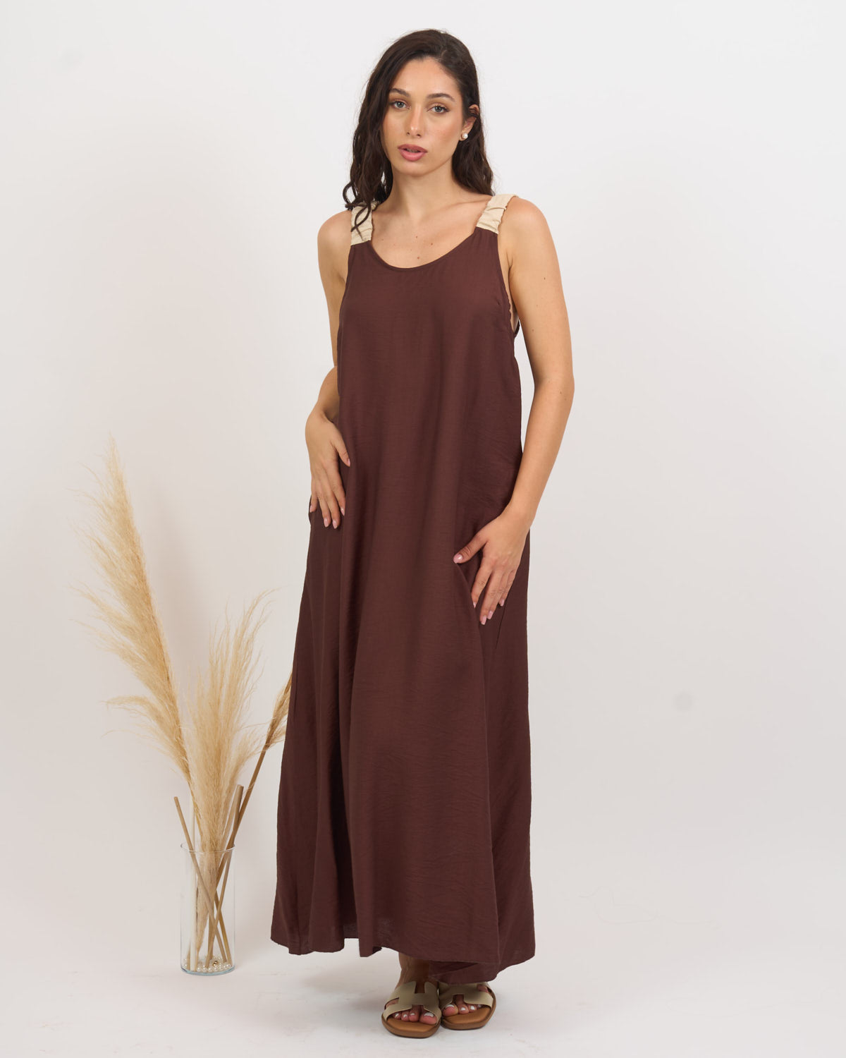 Abito in tessuto leggero e fresco con bretelline larghe ed elasticizzate, retro con fiocco. Fondo ampio senza spacco, veste tutte le taglie. Con tasche