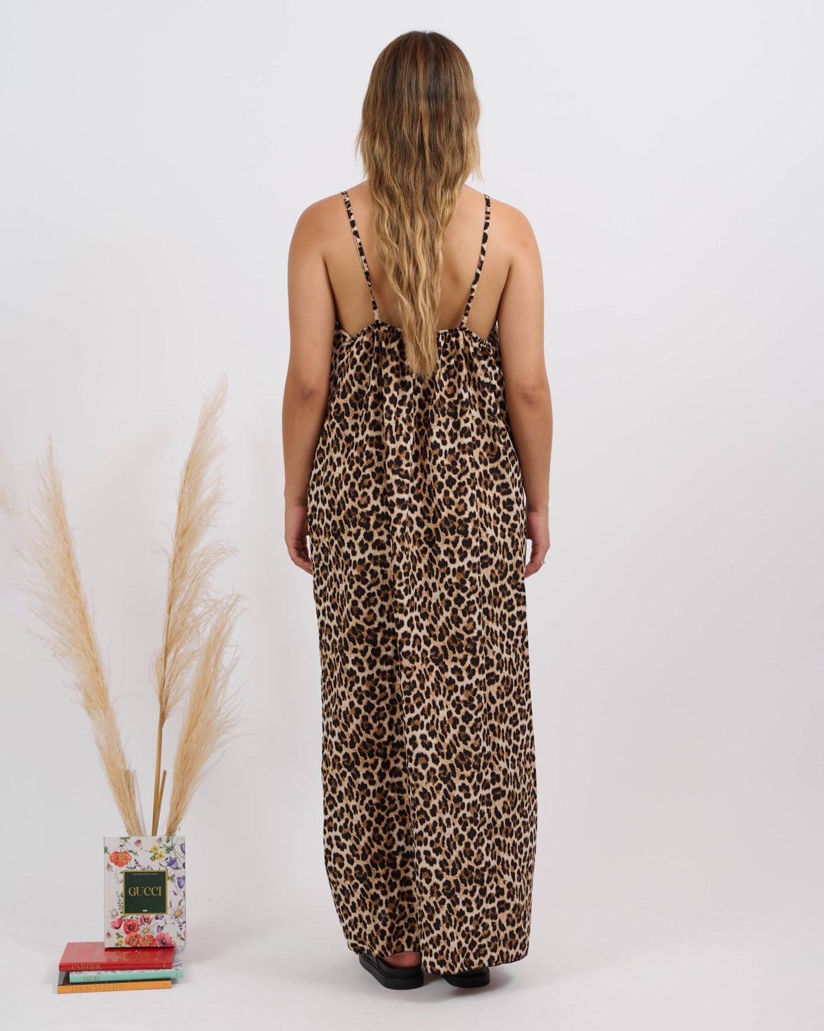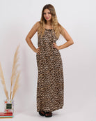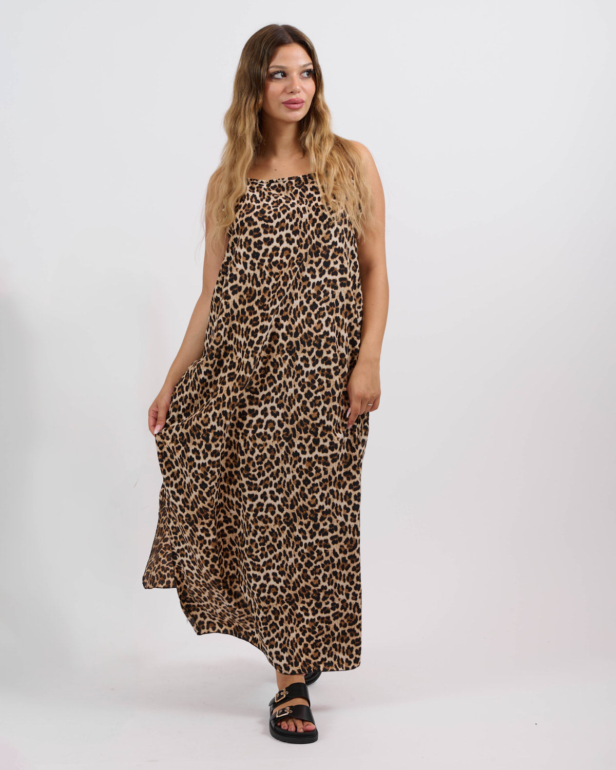 Abito stampato con spacco laterale, modello a bretelline con retro elastico. In taglia unica veste fino a LXL.
