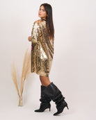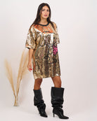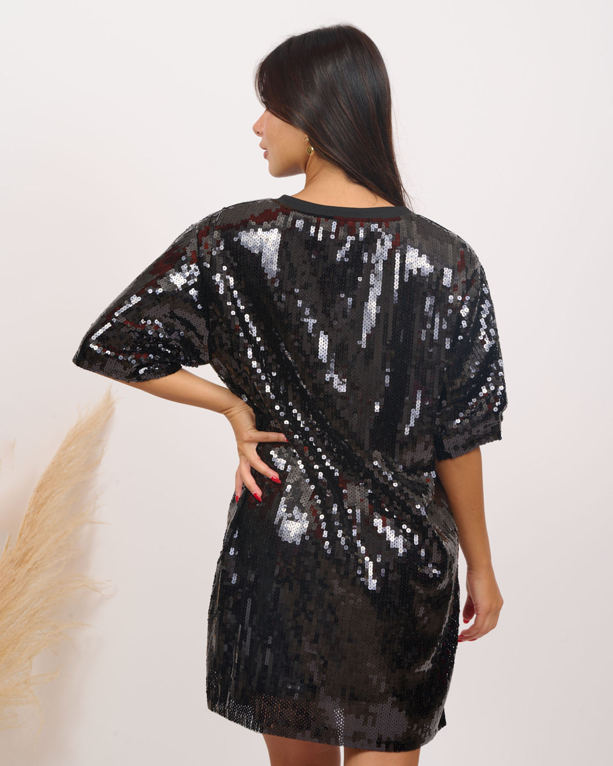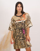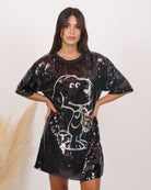 Abito di paillettes con fantasia Snoopy con interno foderato.