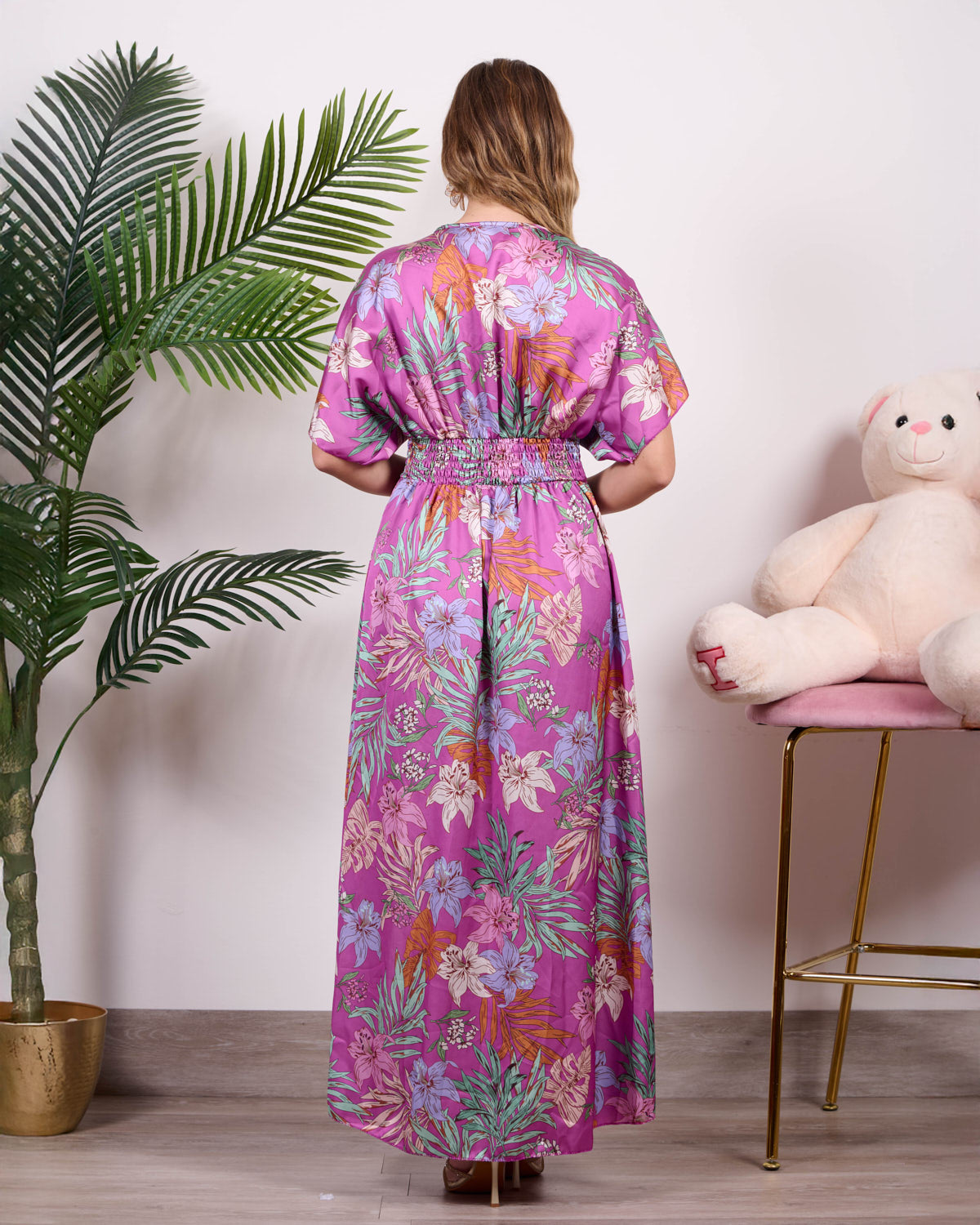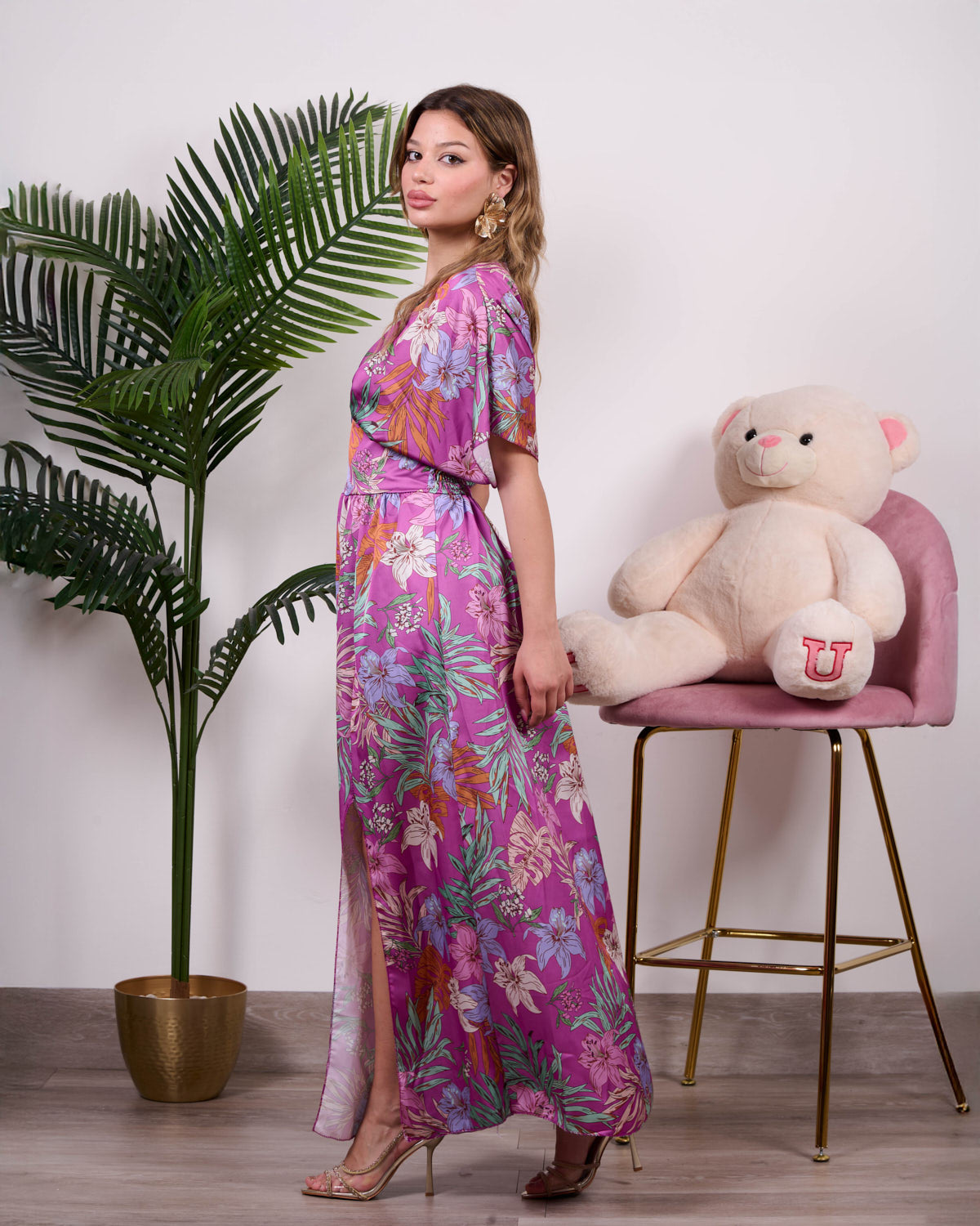 Abito in tessuto effetto raso con scollo omerale, elastico sul retro. Maniche morbide e leggero spacco sul fondo.