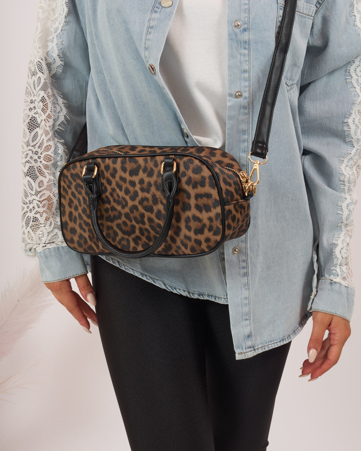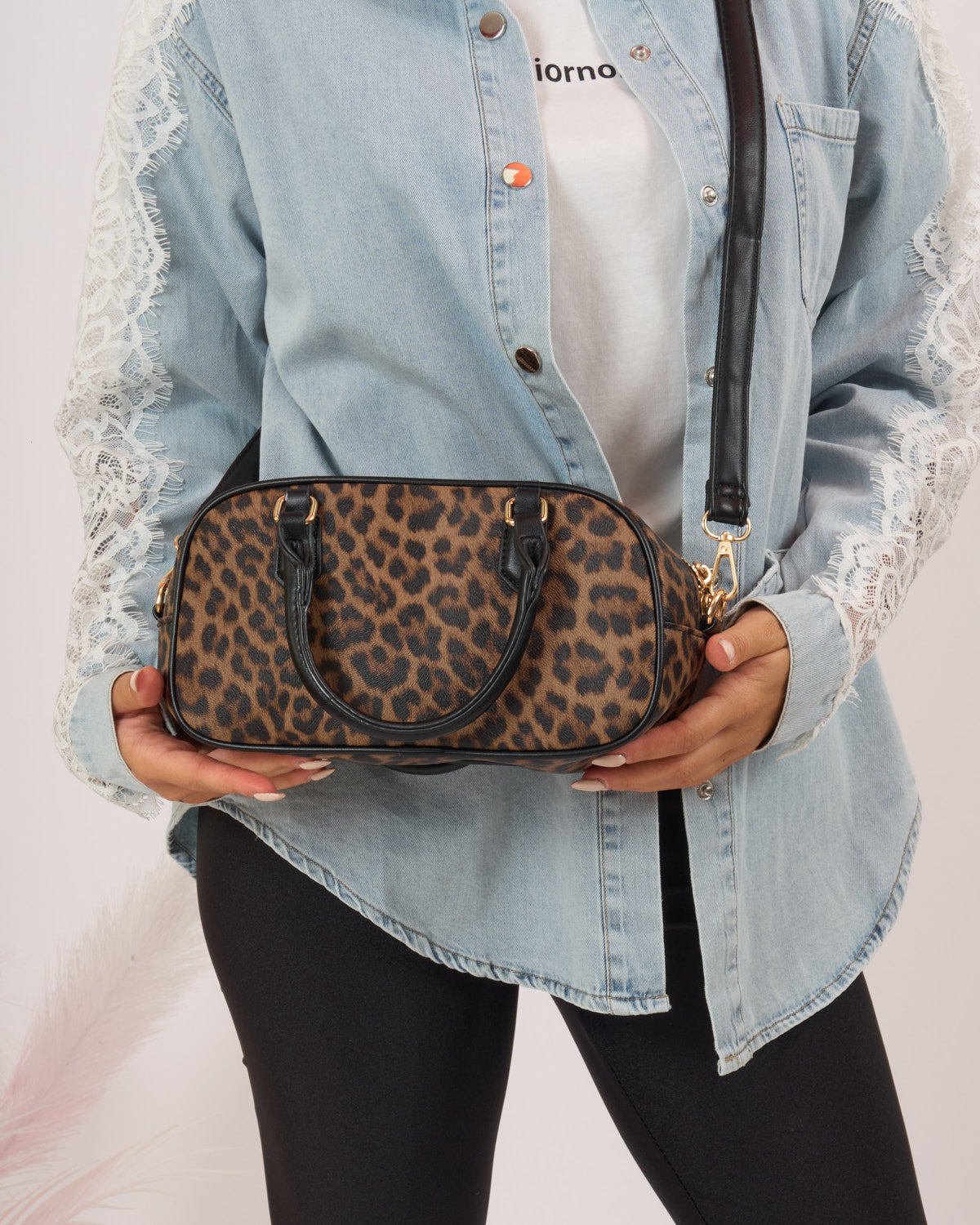 In ecopelle con tracolla a mano e a spalla, chiusura zip ed interno foderato.