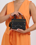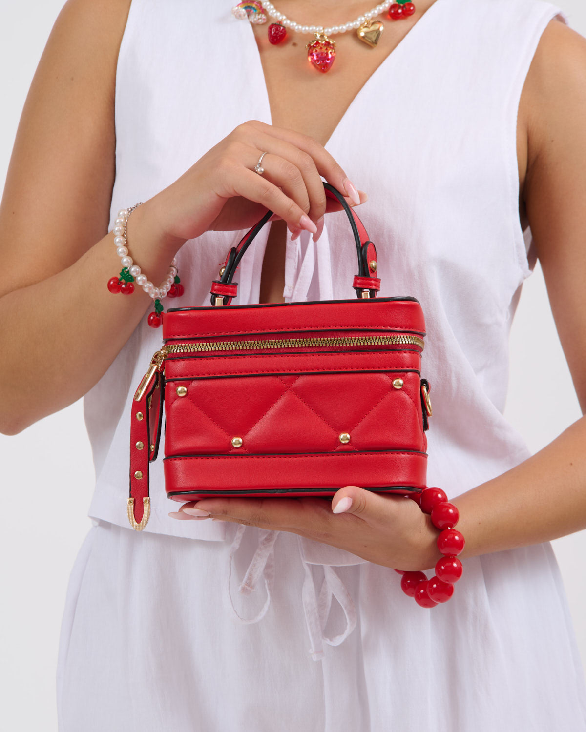 In ecopelle a forma di beauty con tracolla a mano e a spalla interna inclusa.