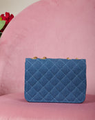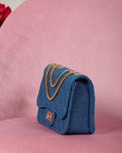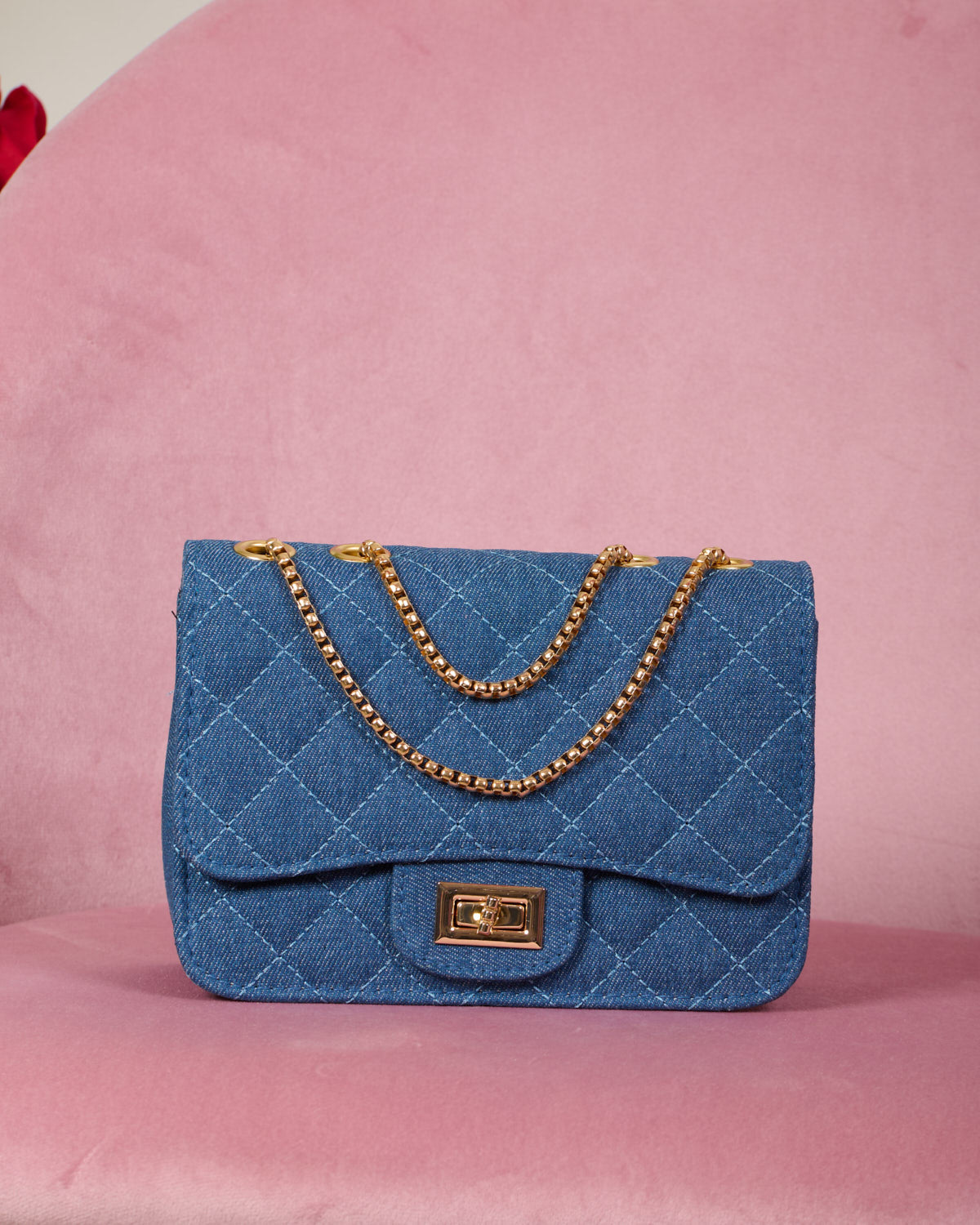 in tessuto jeans, chiusura sul davanti e tracolla in catena colore oro.