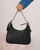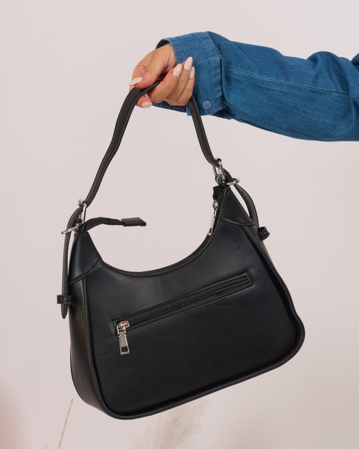 In ecopelle con chiusura zip con tracolla a spalla inclusa.