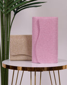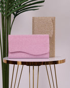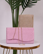 Pochette in tessuto glitter con tracollina in catena inclusa regolabile. Chiusura magnetica.