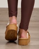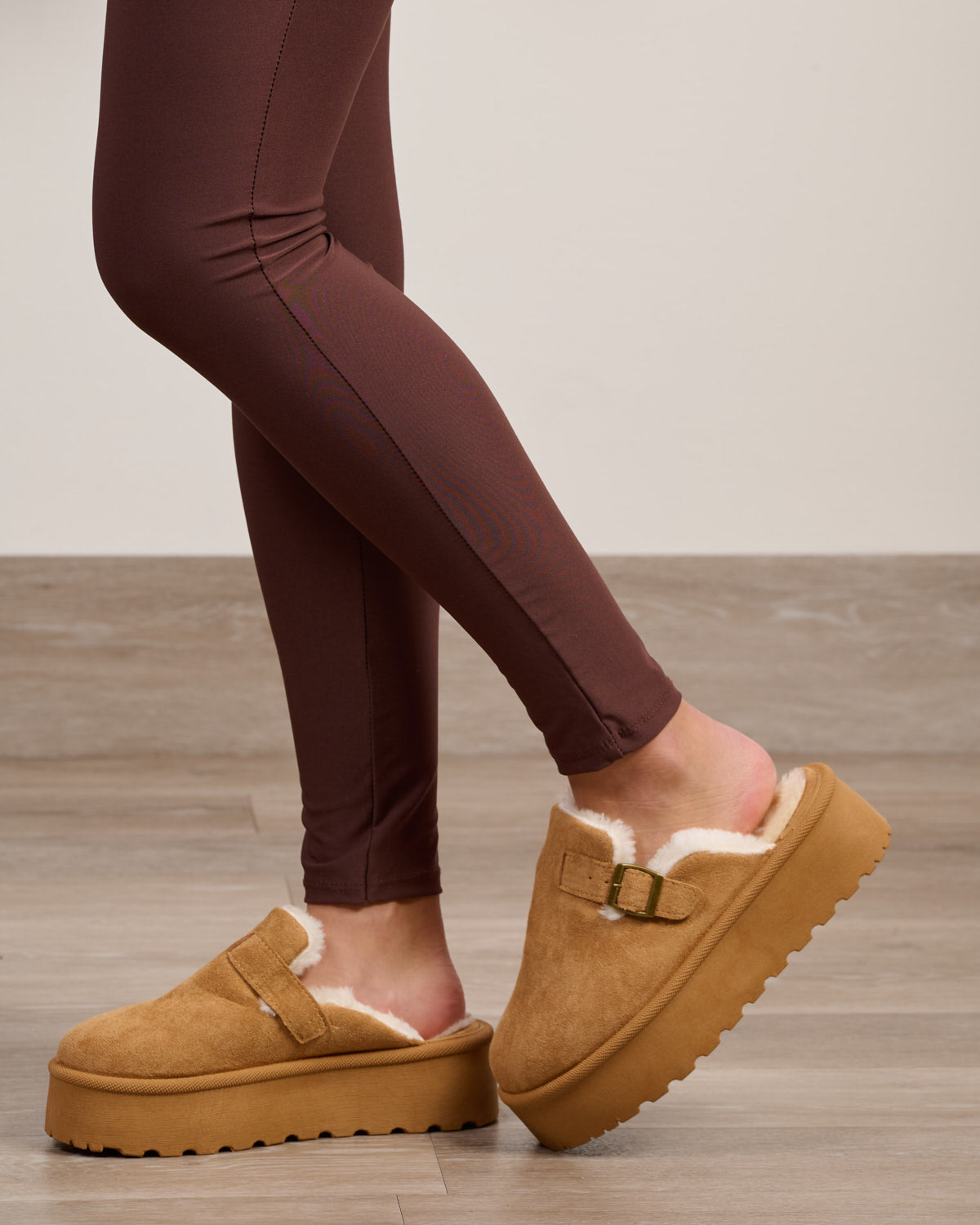 Ciabatta con pelliccia all’interno e fibia. Plateau di 5 cm. Calzata regolare, per chi oscilla tra due numeri, consigliamo il numero in più.