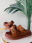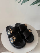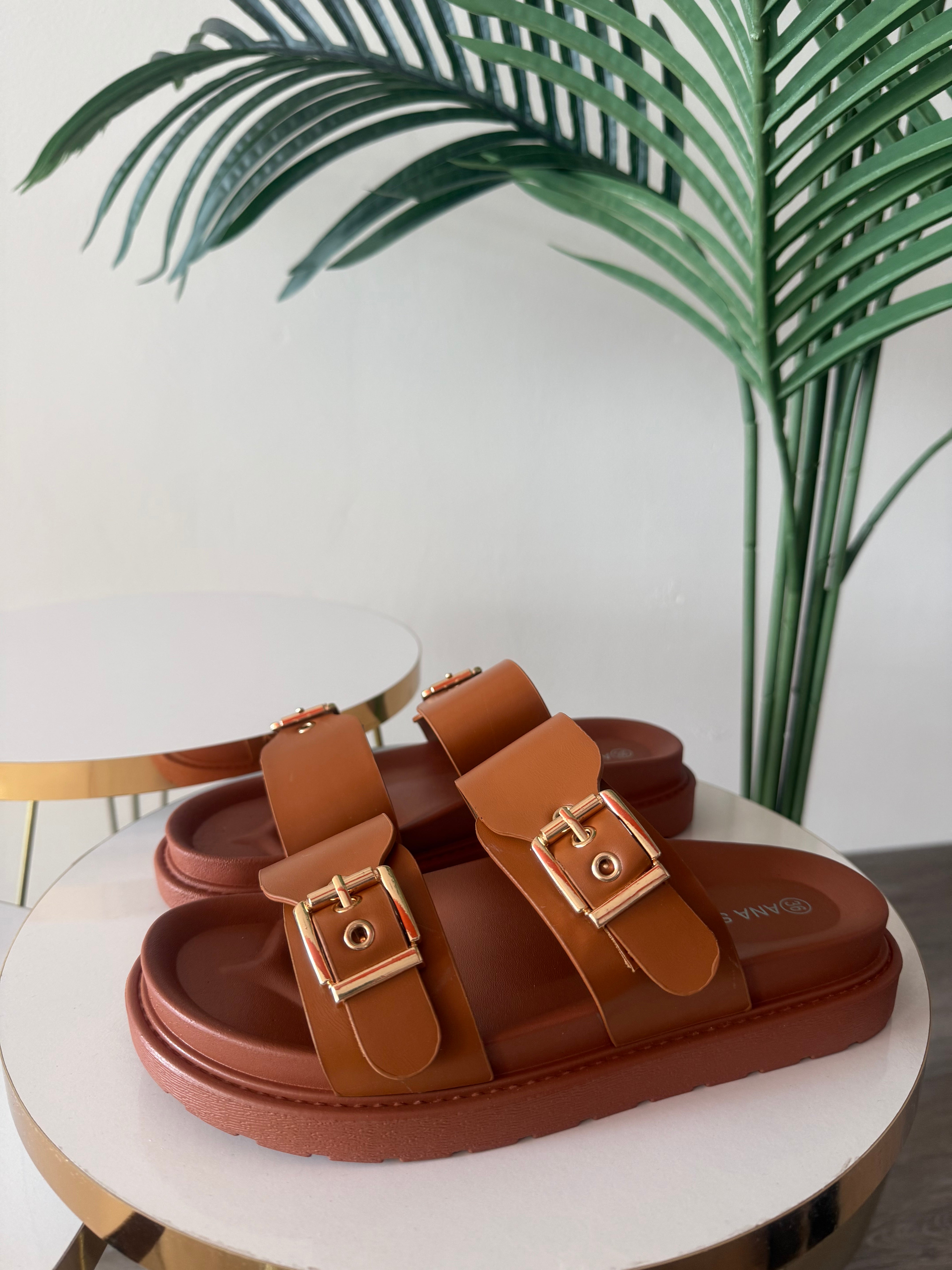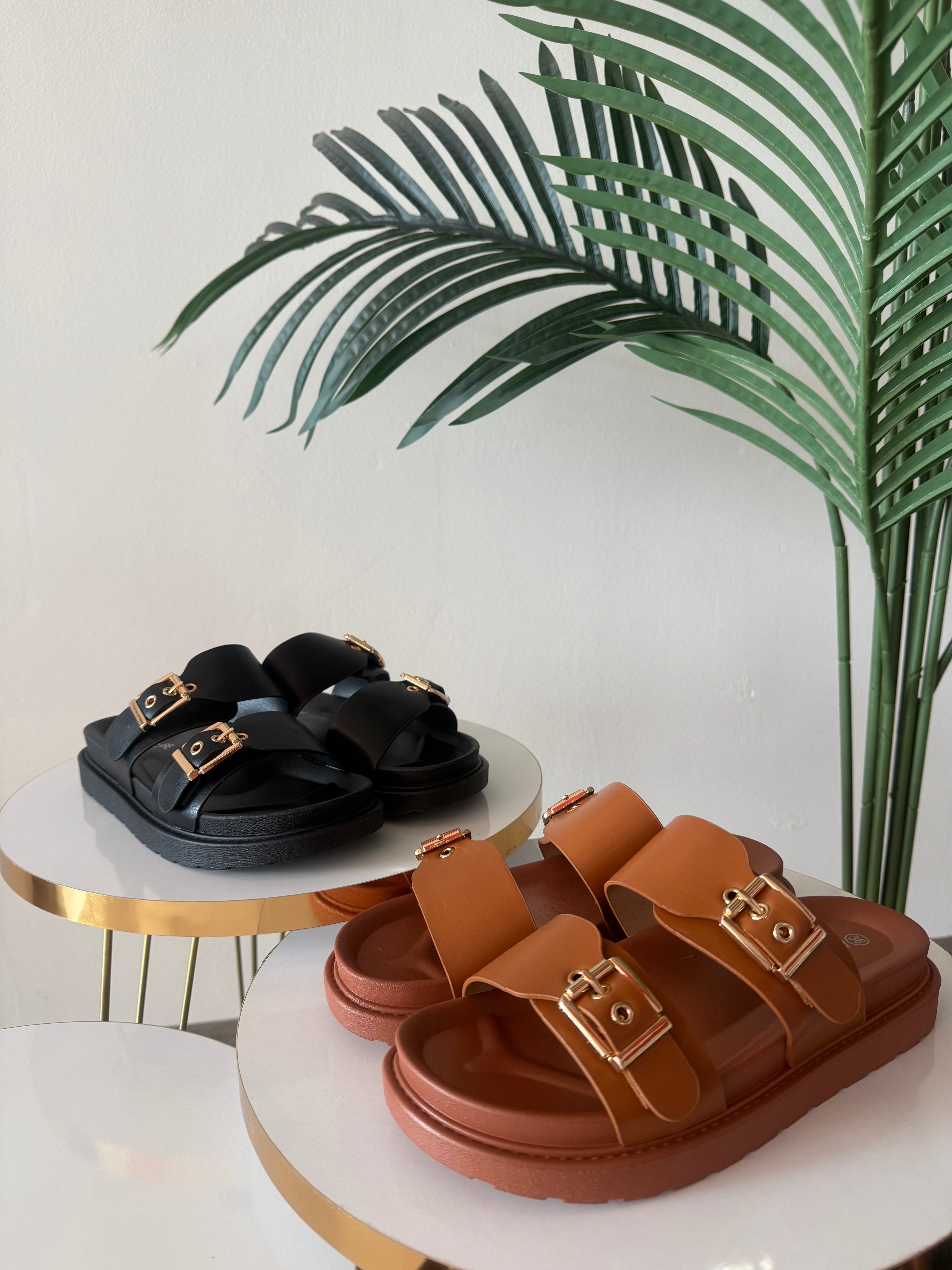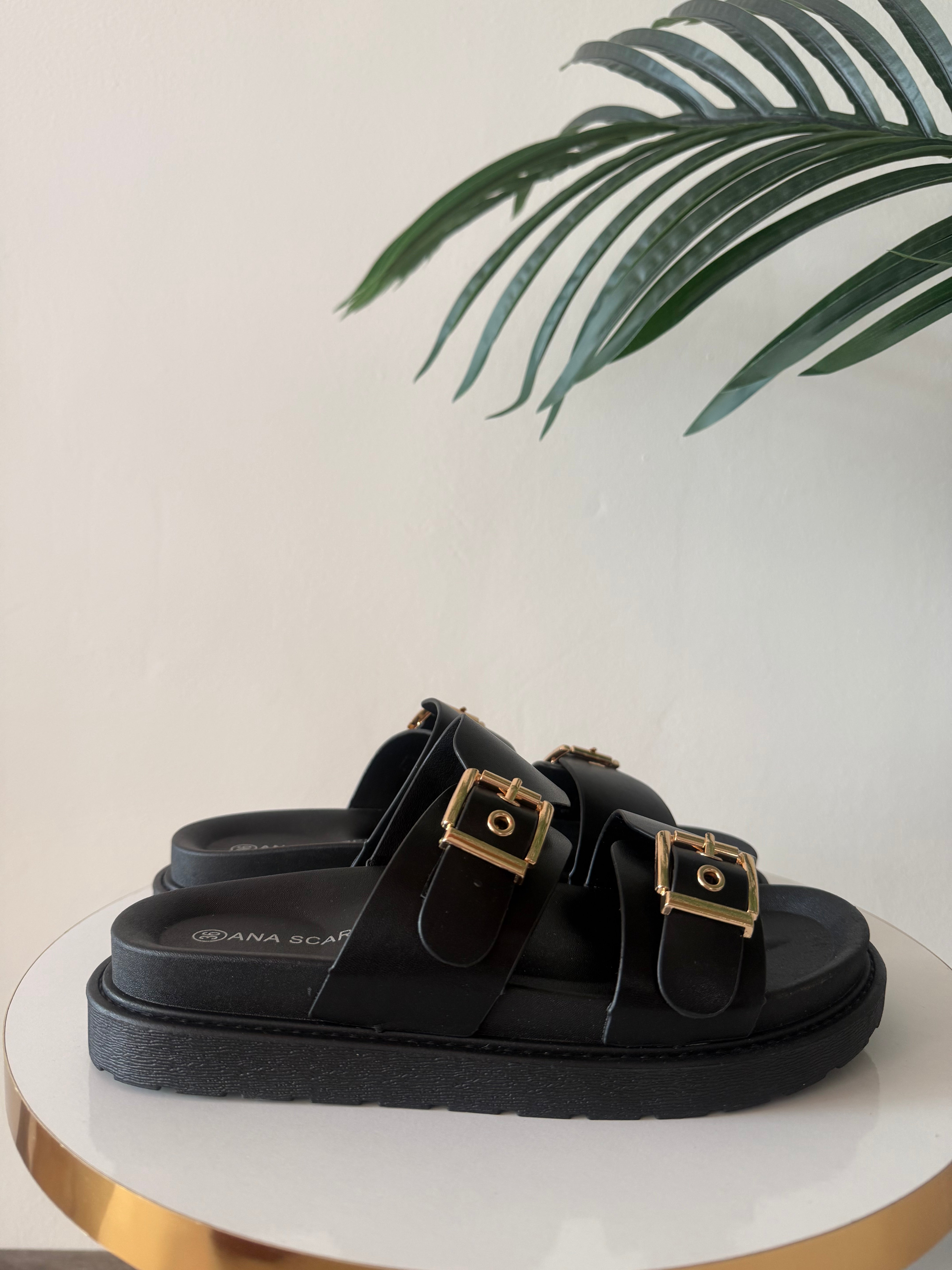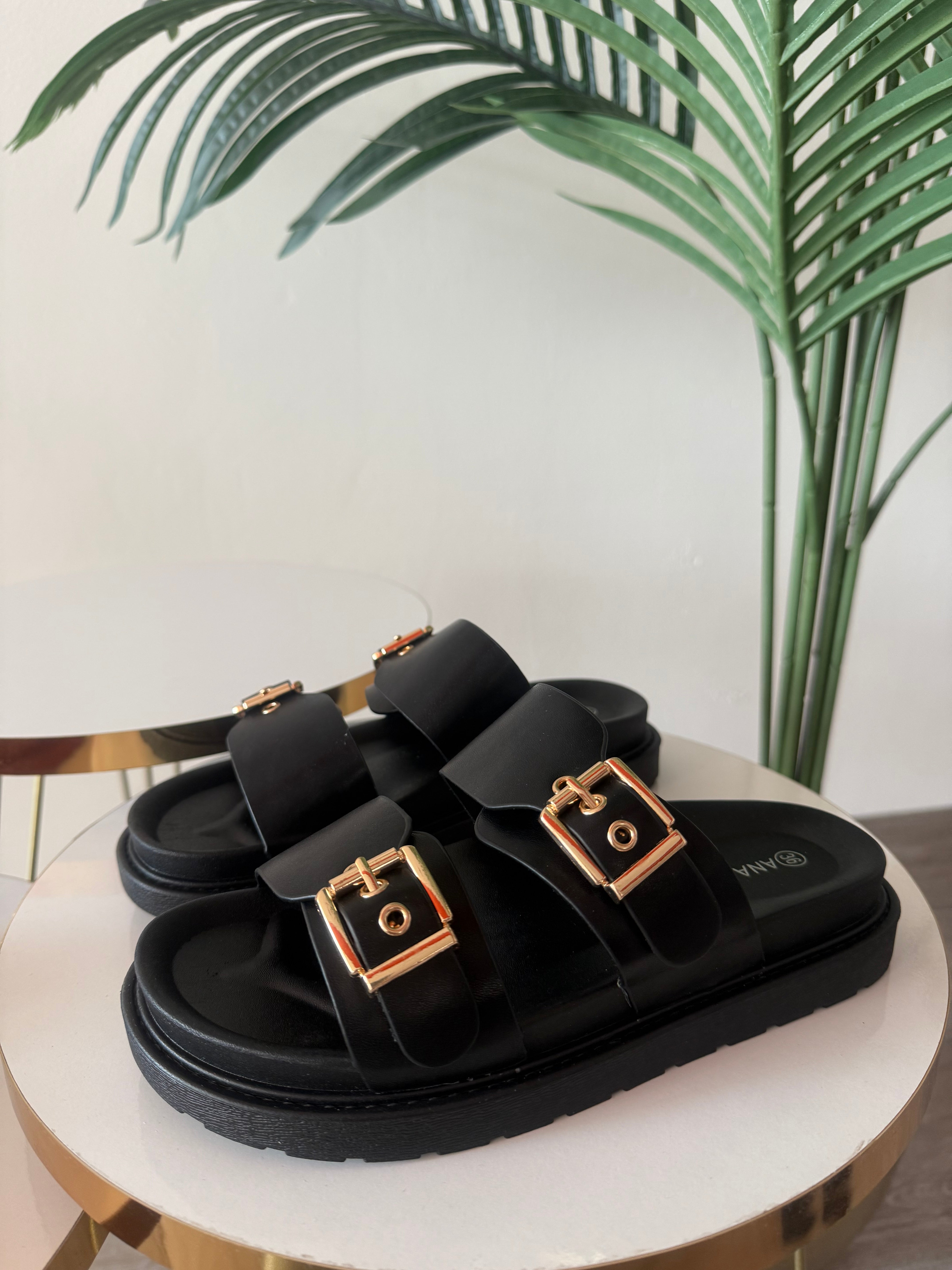 Ciabatta in morbida ecopelle con suola in gomma antiscivolo. Fibbia color oro regolabile. Calzata comoda.