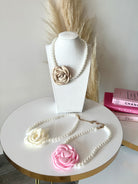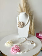Collana con perline e rosa applicata. Ganci in acciaio anallergico.