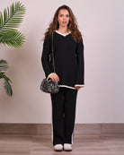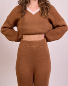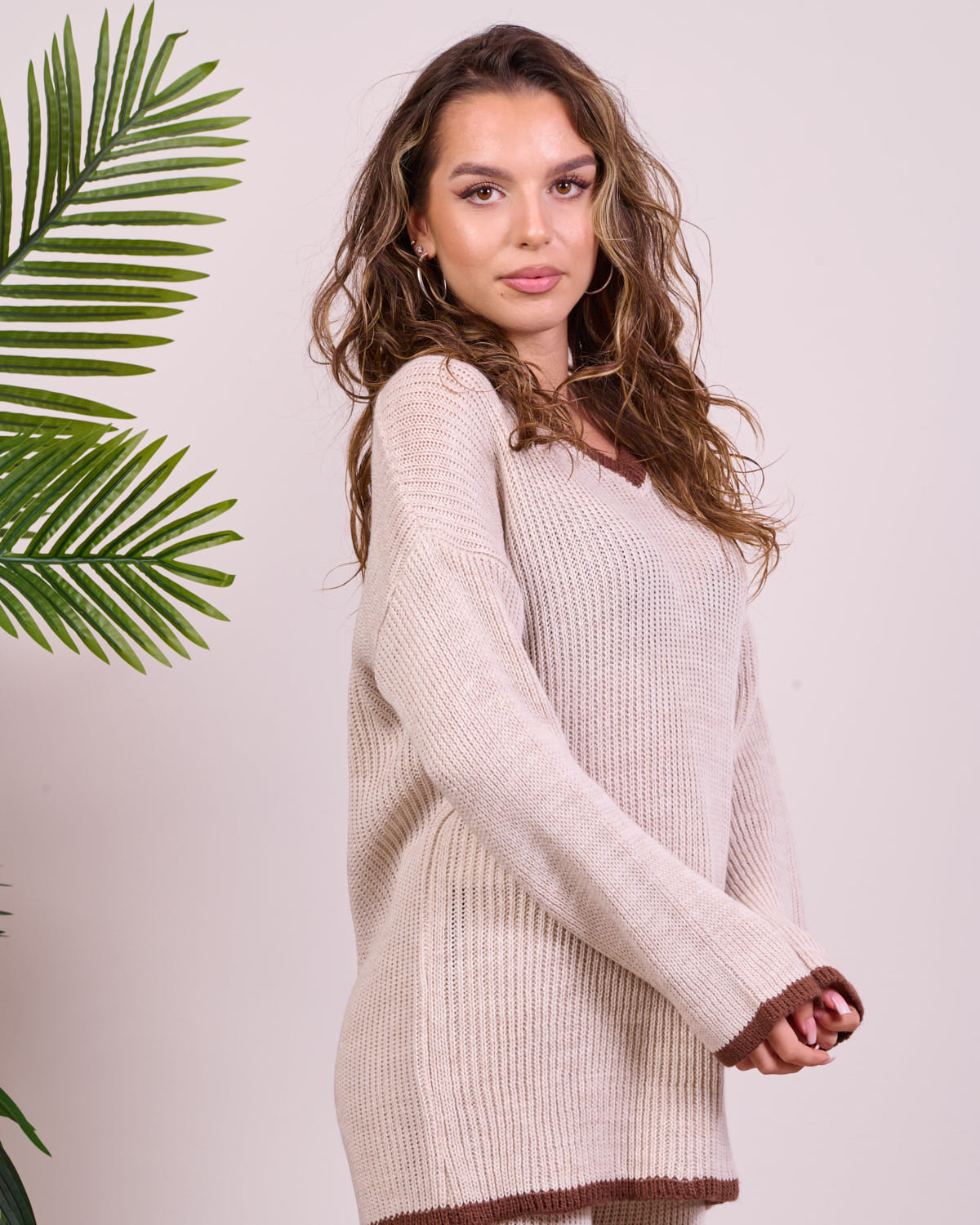 Coordinato composto da pull con scollo a V non profondo, pantalone alta vita con elastico. In taglia unica veste fino a taglia 46/48. Composizione: 100% acrilico