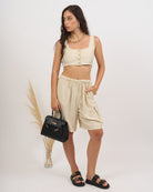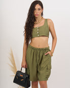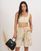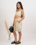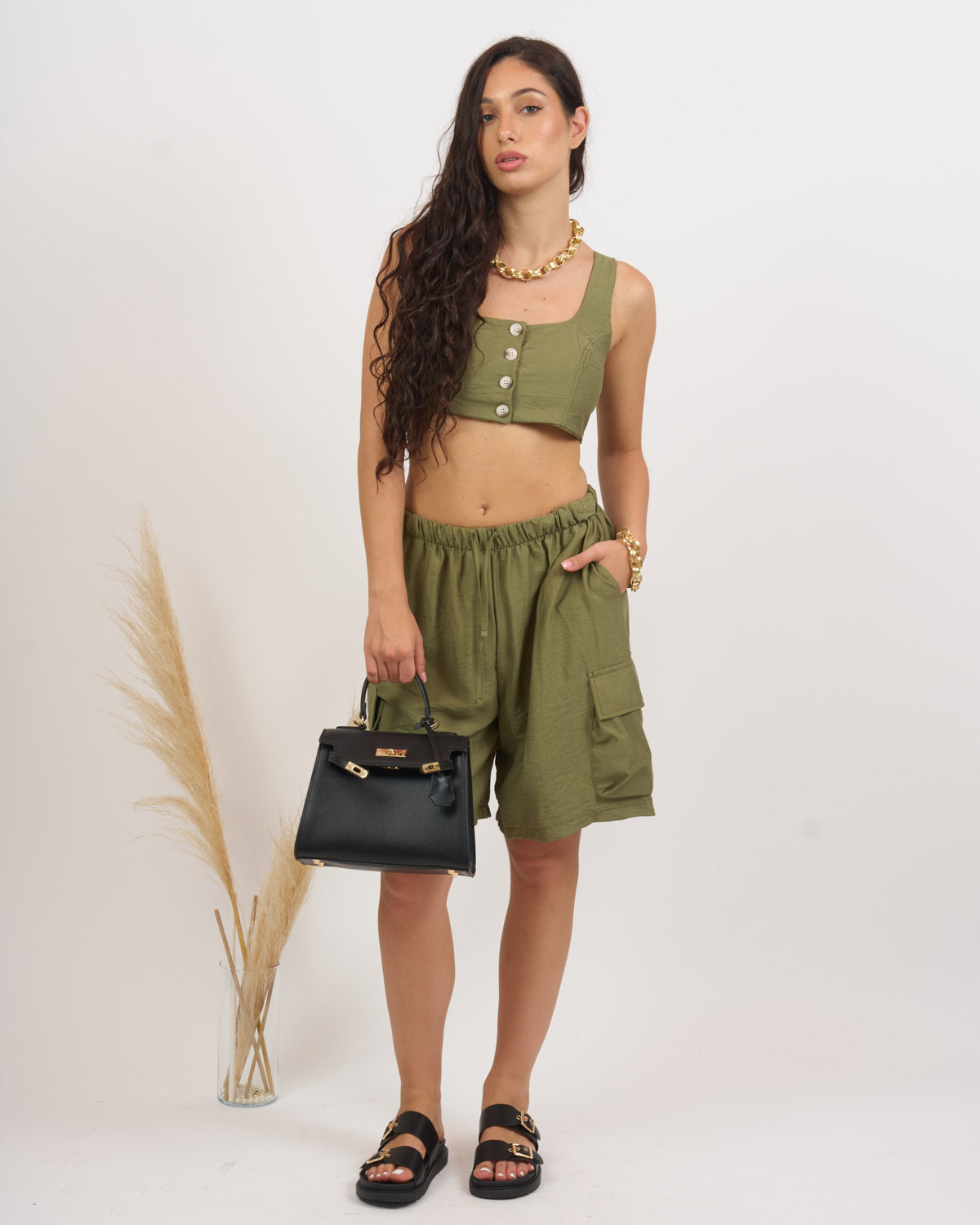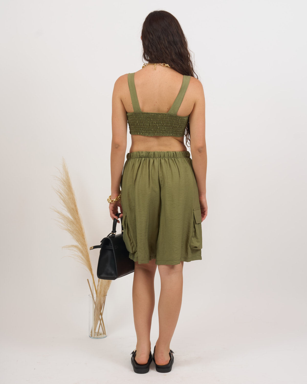 Composto da top crop con retro elasticizzato, pantalone tascone alta vita con elastico e lacci regolabili. In taglia unica veste fino a L.