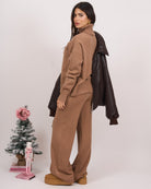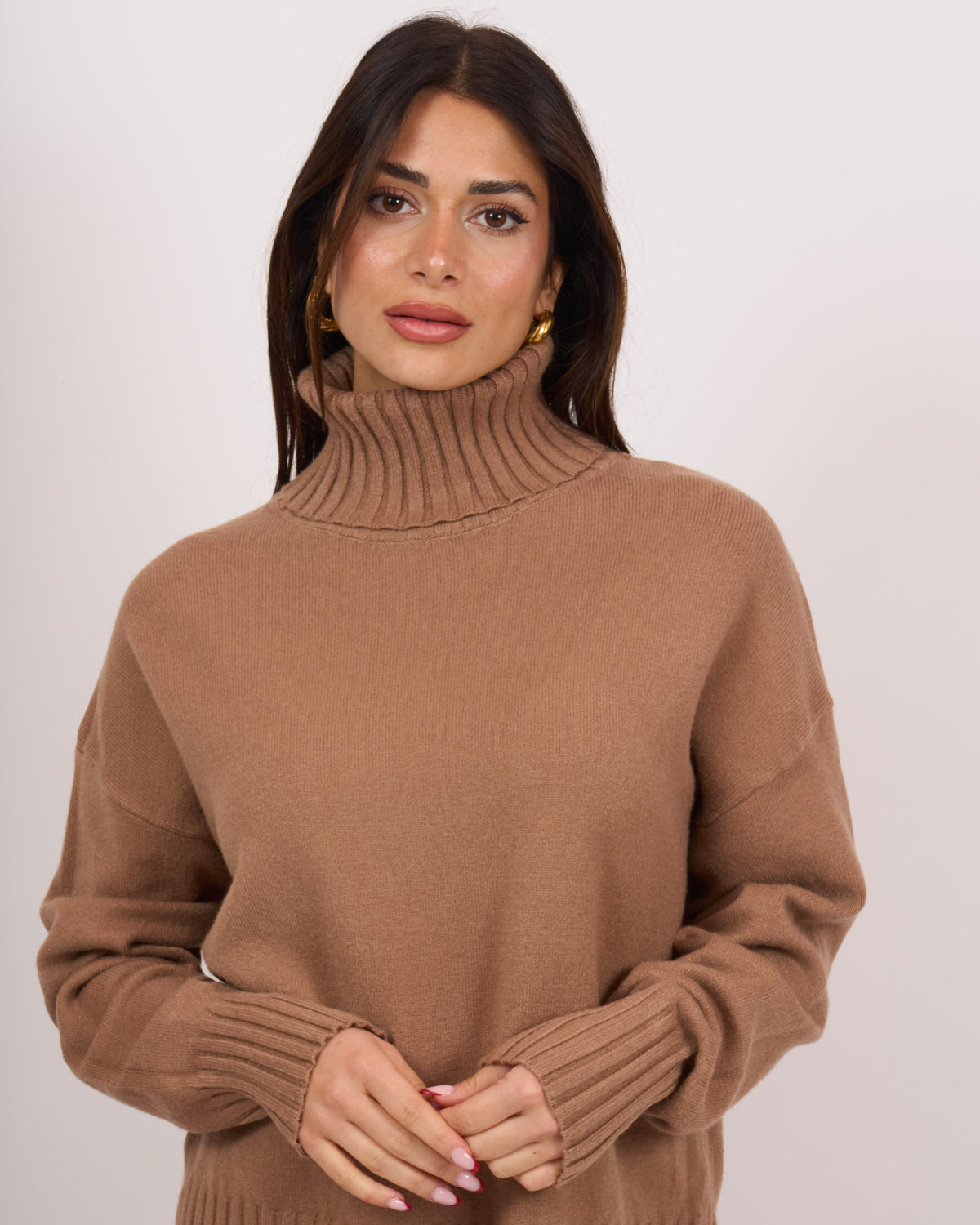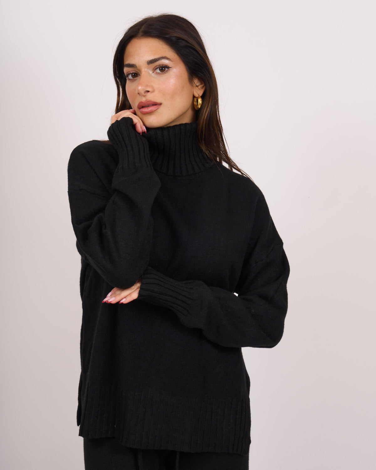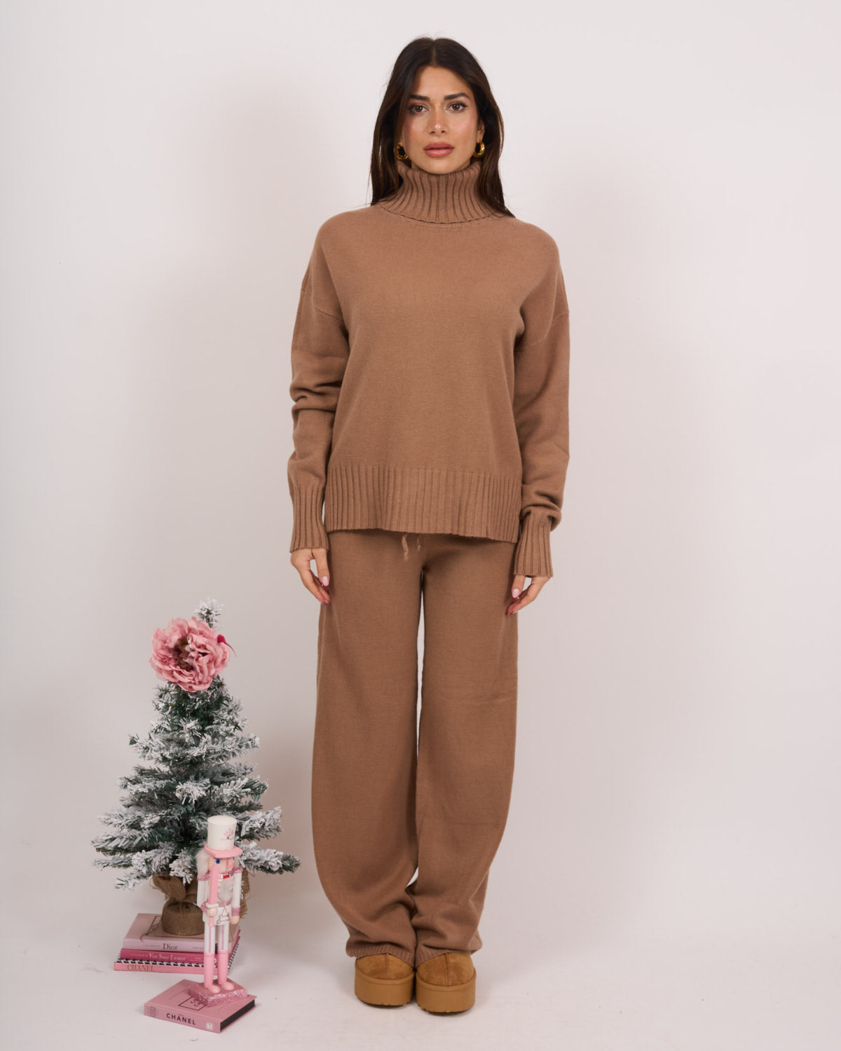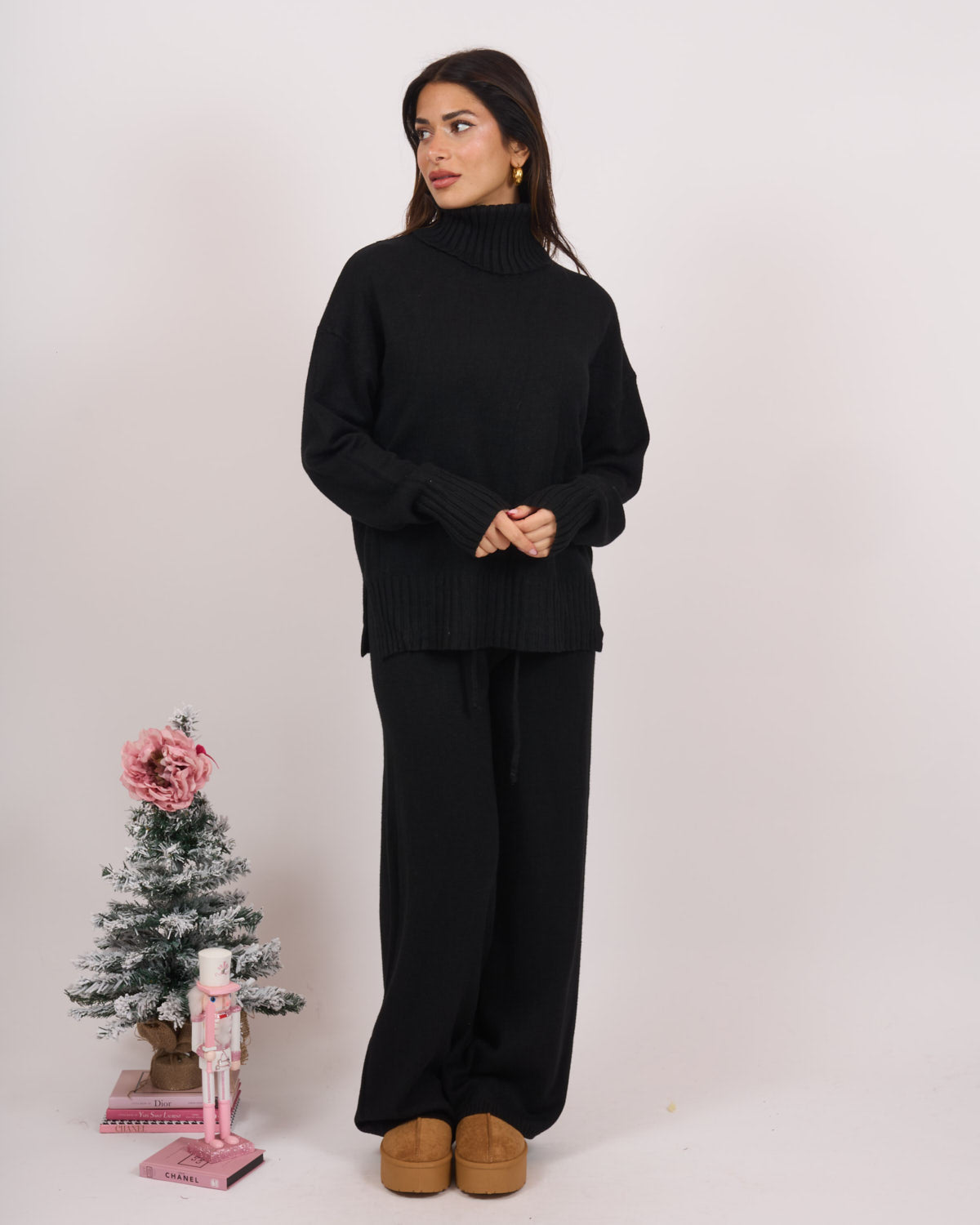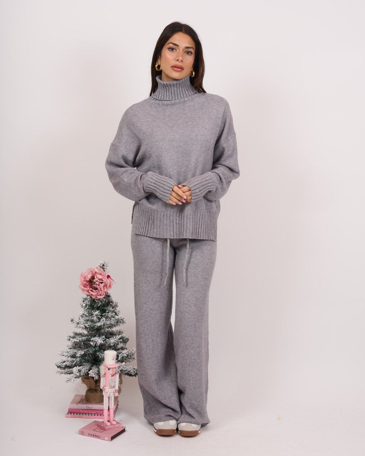 Coordinato in morbida lana rasata composto da maglione collo alto con spacchi laterali, pantalone alta vita con elastico e laccetti.