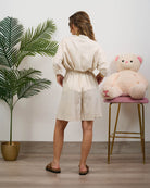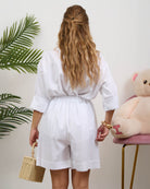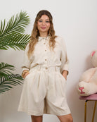 Coordinato di lino composto da camicia con bottoncini e bermuda alta vita con elastico sul retro. In taglia unica veste fino a L/XL.