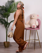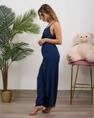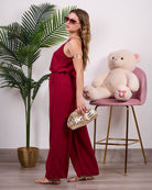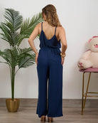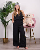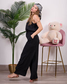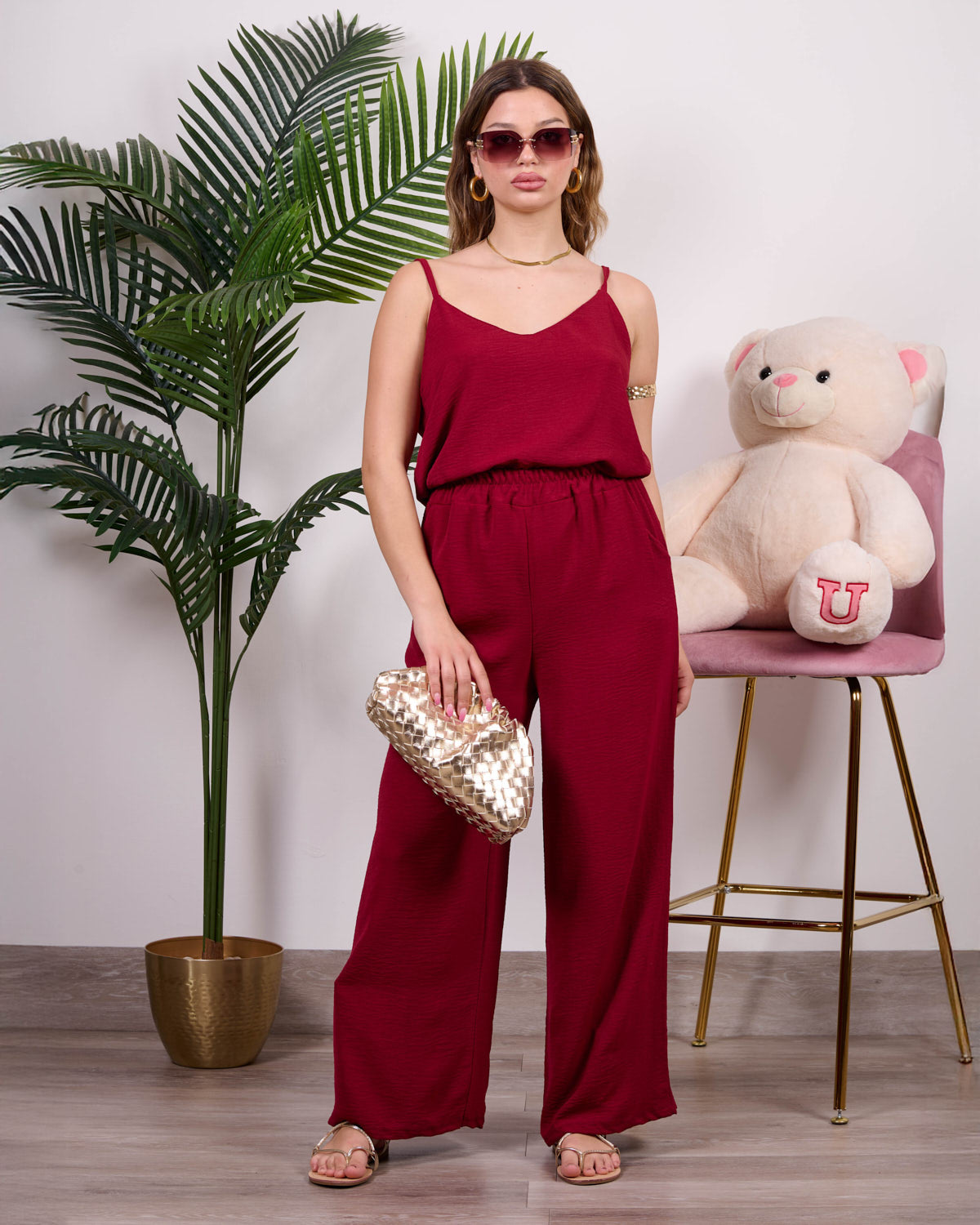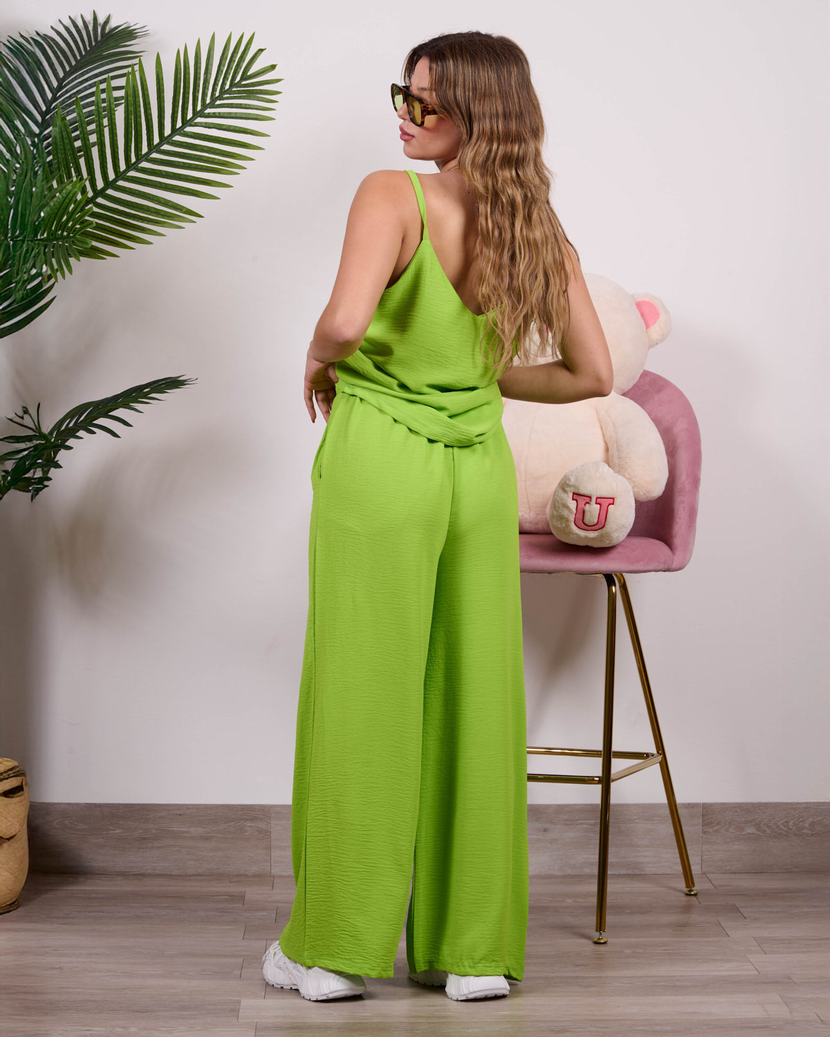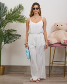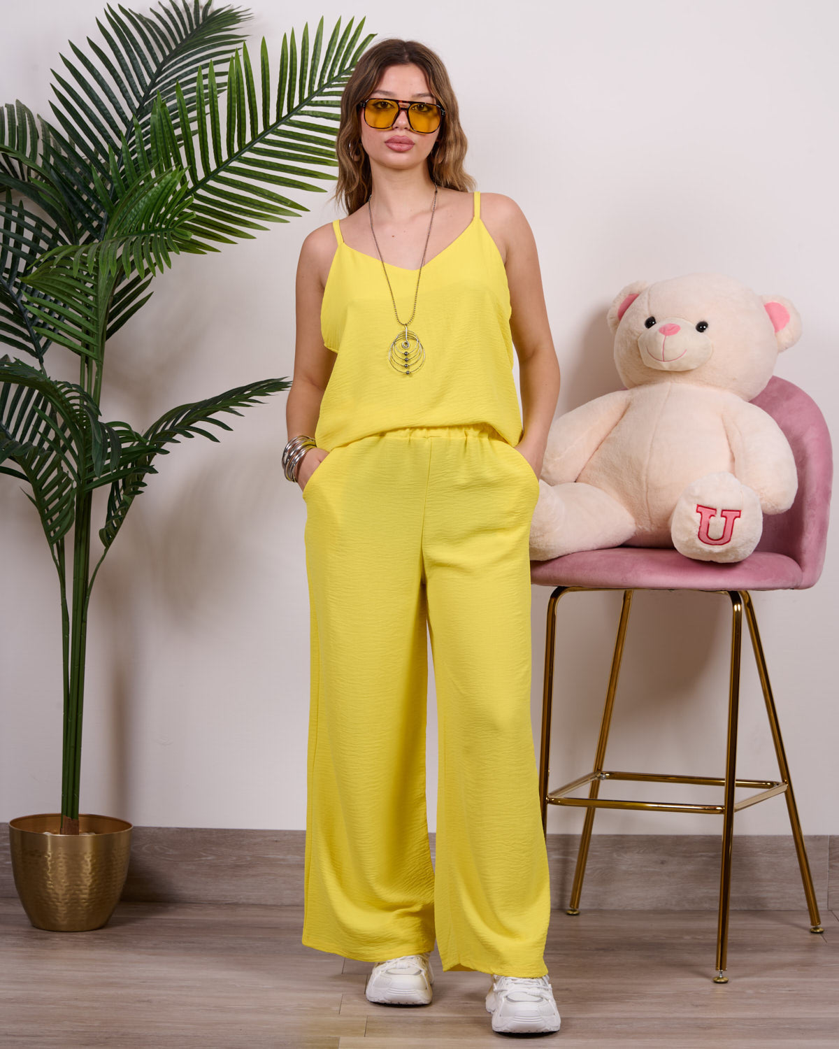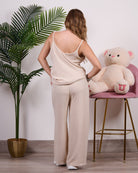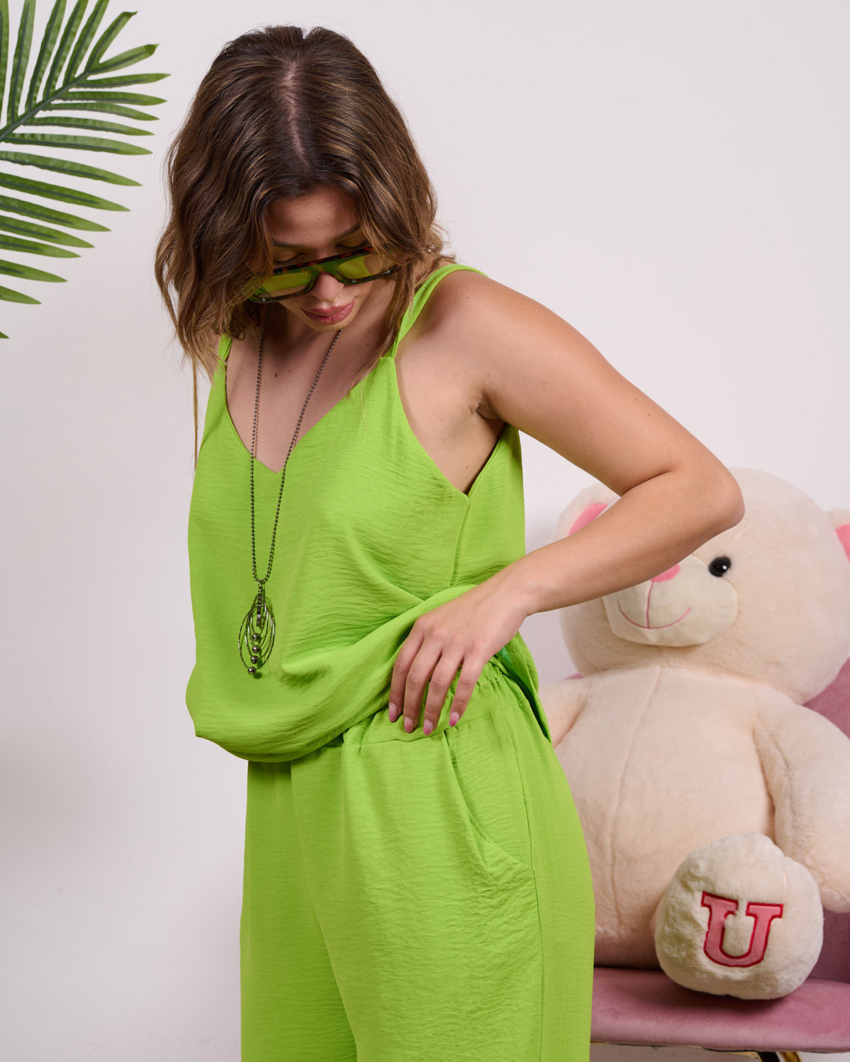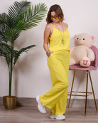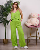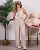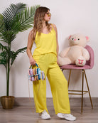 Coordinato composto da blusa a bretelline con pantalone alta vita con elastico e tasche.
