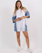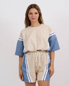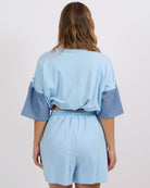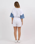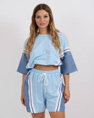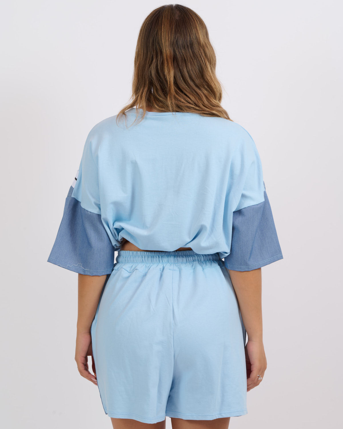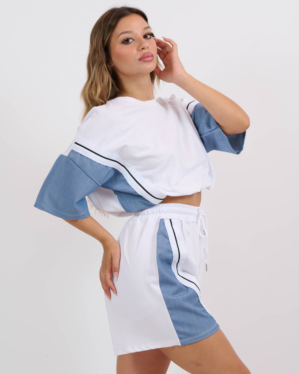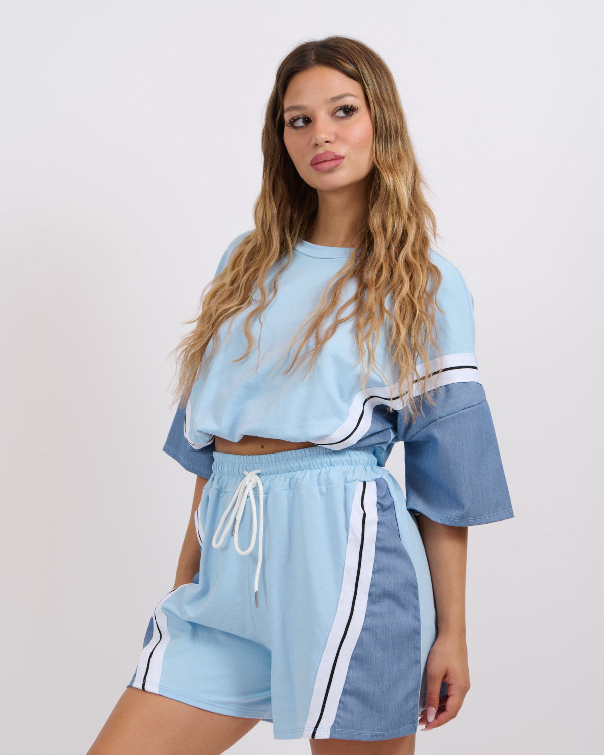 Coordinato due pezzi in cotone elasticizzato composto da maglia cropped con elastico in vita e maniche con inserti denim. Pantaloncini alta vita con elastico e lacci regolabili.