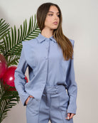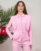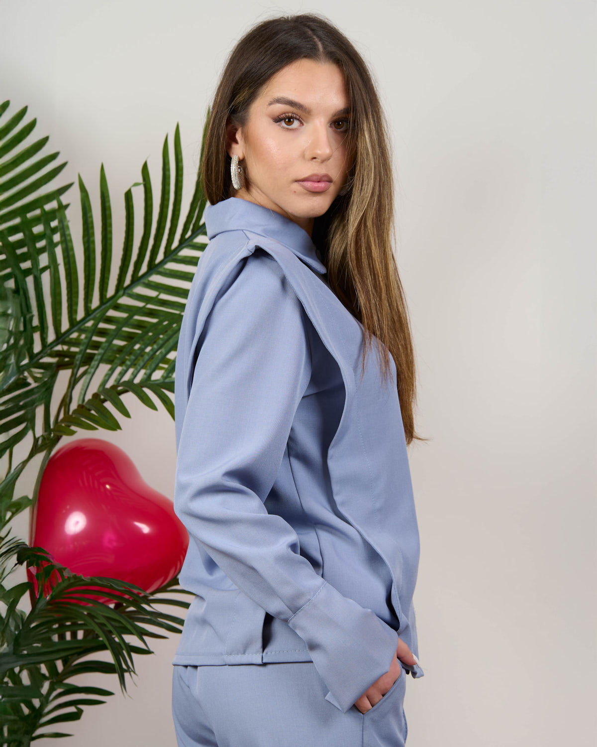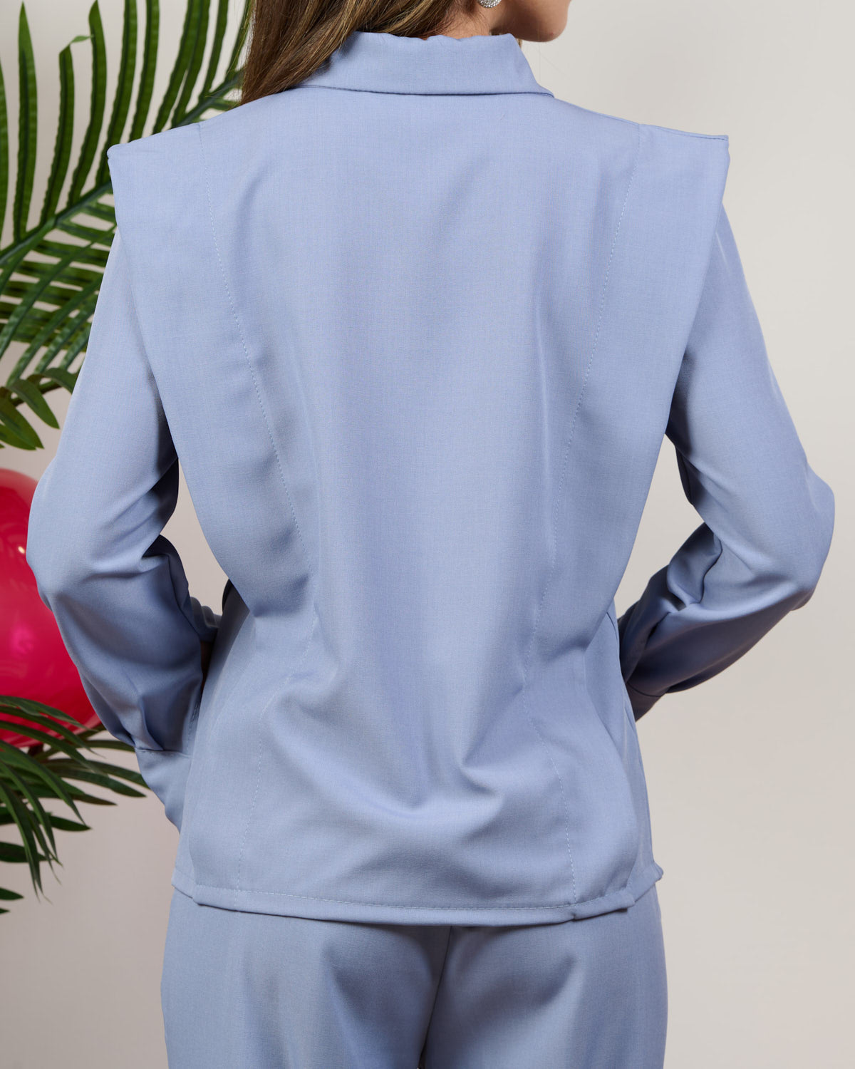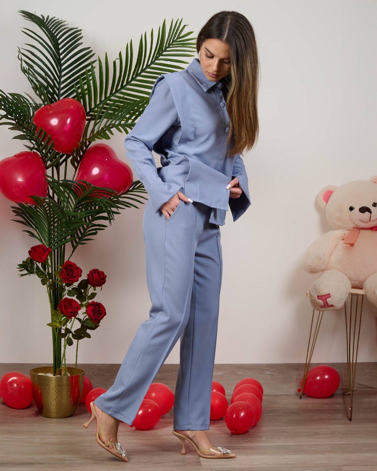 Coordinato composto da blusa con bottoncini in tono sul davanti e ai polsi, pantalone alta vita con chiusura zip e bottoncini con tasche. In taglia unica veste fino a L