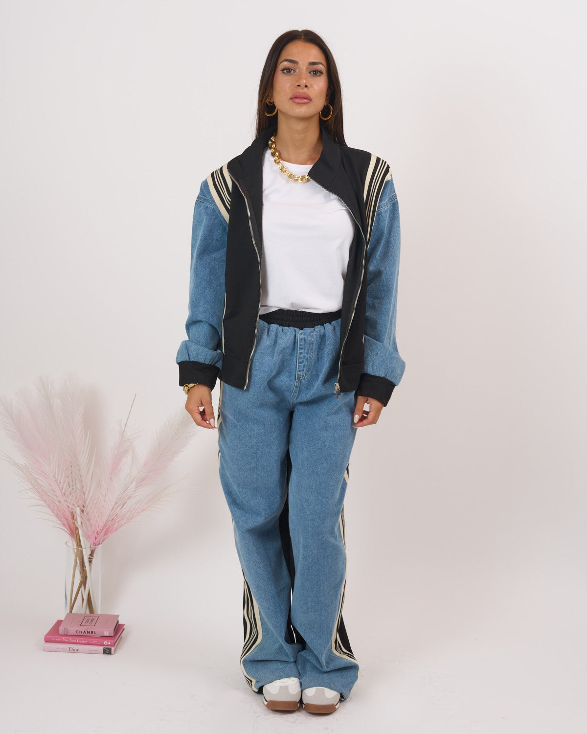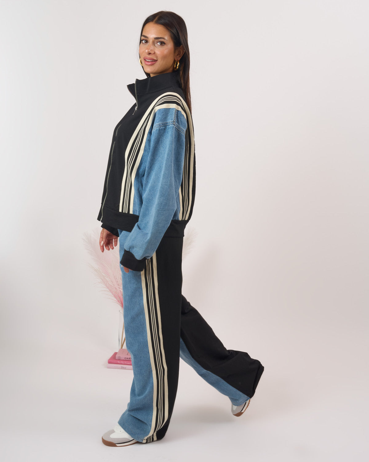 Coordinato composto da felpa con inserti denim e zip in acciaio.