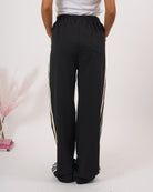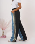 Pantalone vita alta con tasche, parte anteriore in denim e posteriore in cotone elasticizzato con tasca.