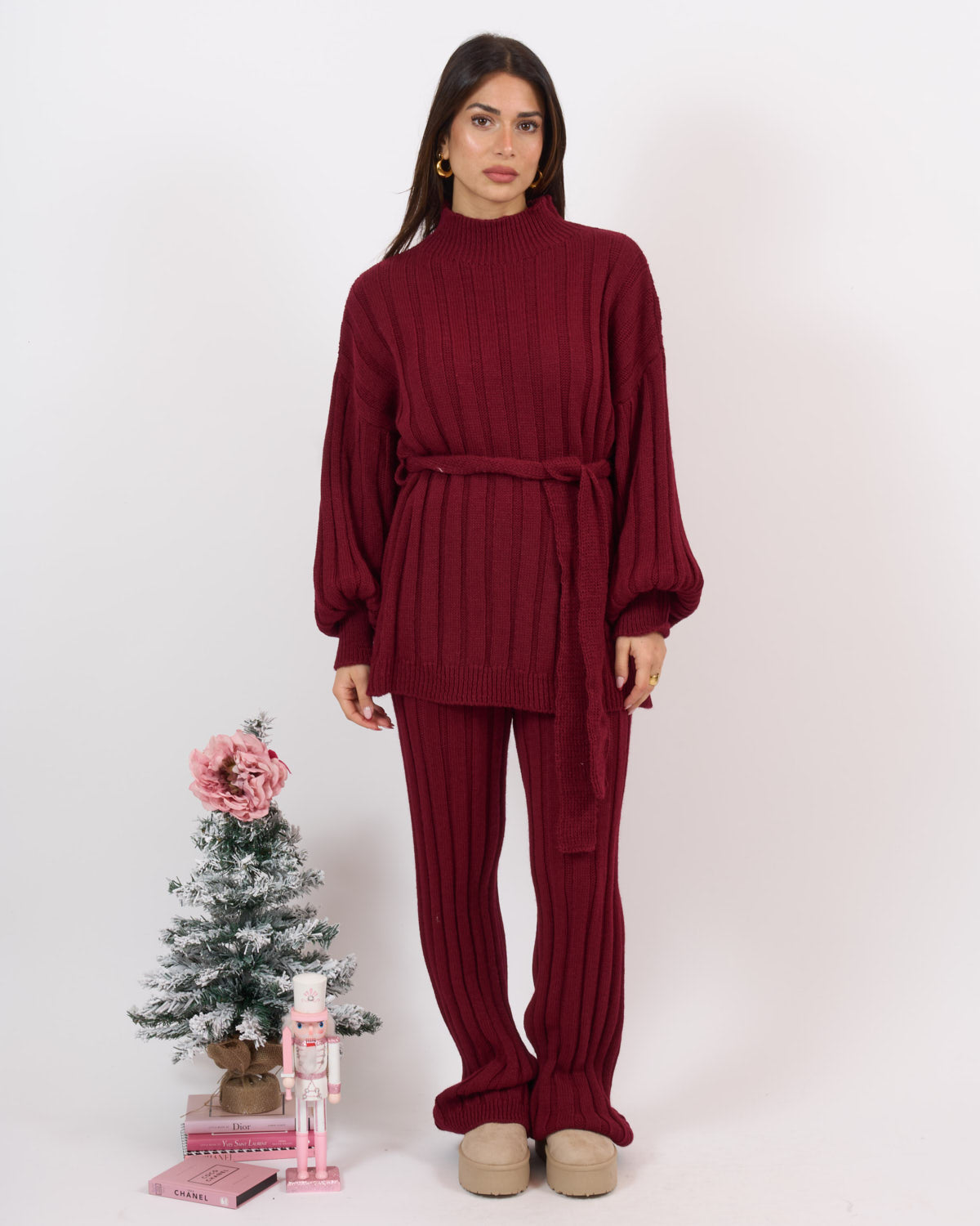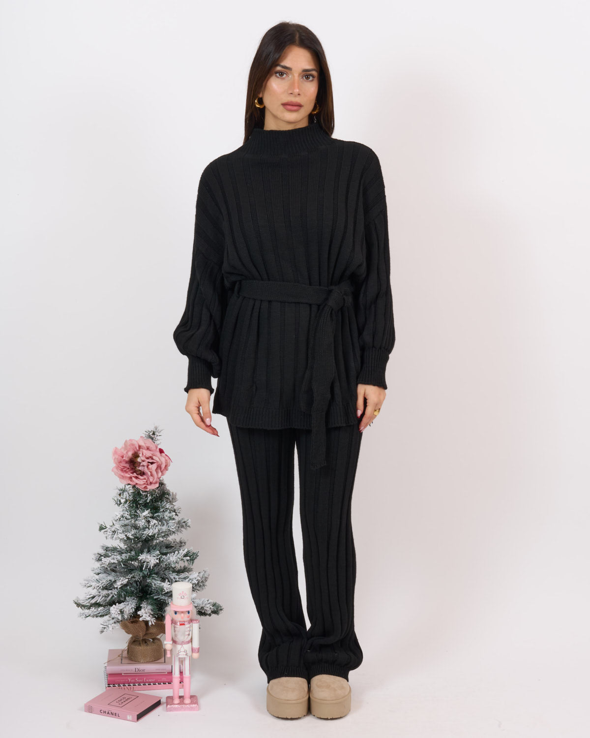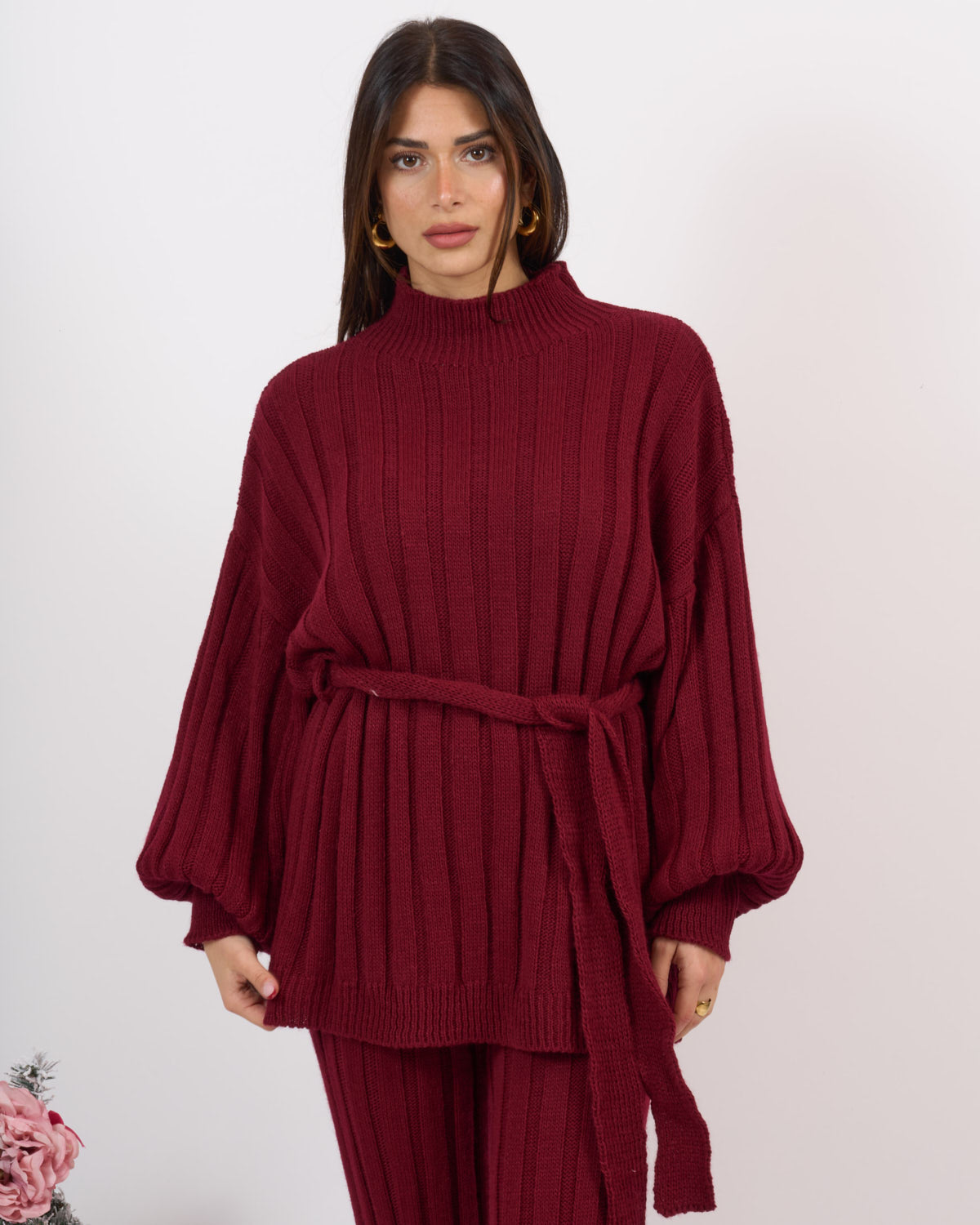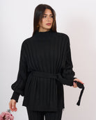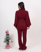 Coordinato 2 pezzi in lana elasticizzata a coste composto da pantalone alta vita con elastico e casacca mezzo collo con fusciacca in vita.
