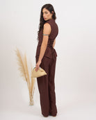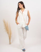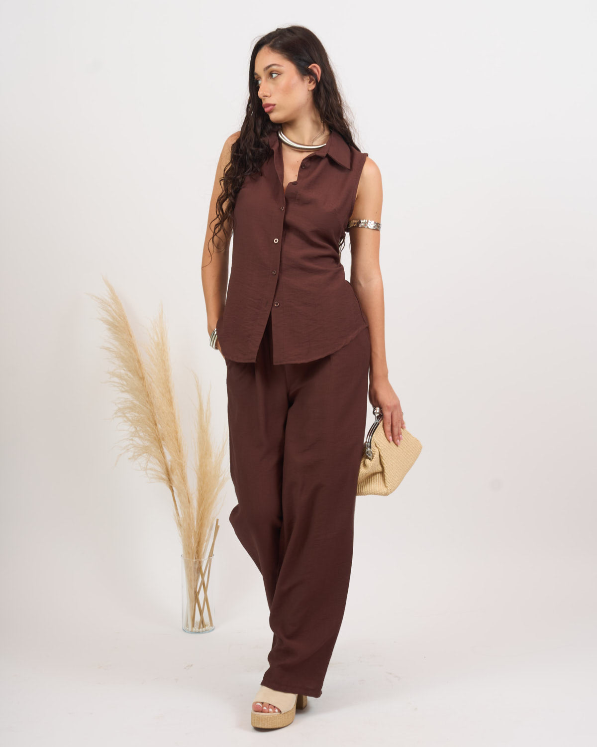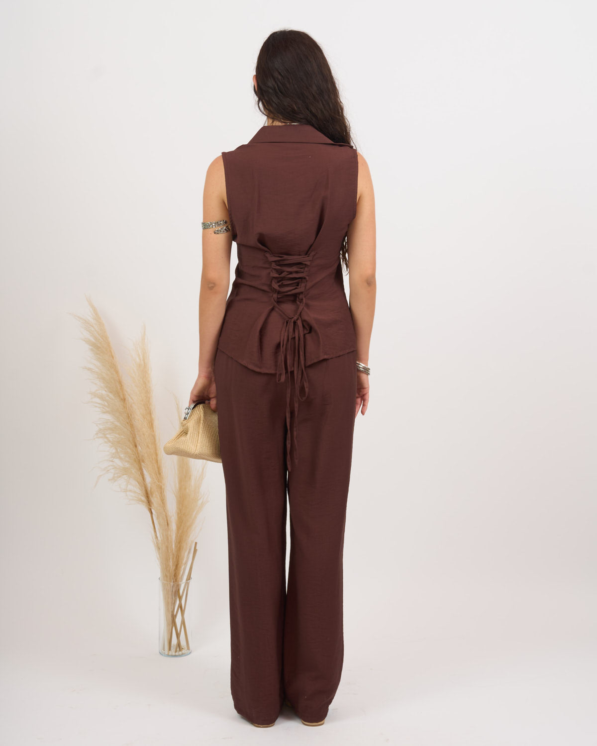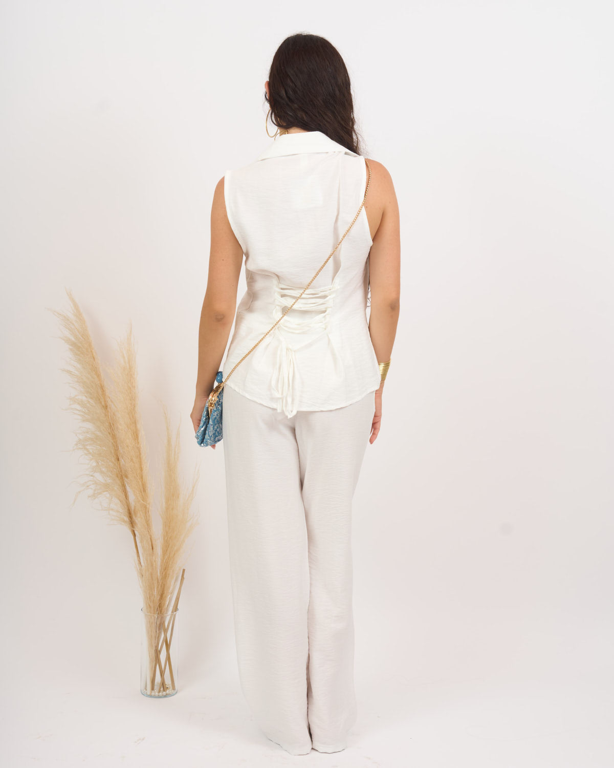 Coordinato in tessuto leggero e fresco composto da camicia/blusa giro maniche con retro con lacci regolabili per modellare la figura. Pantalone alta vita con elastico e tasche, gamba dritta fino al fondo.