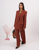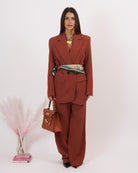 Tailleur composto da giacca modello non aderente con interno foderato, pantalone alta vita con retro elasticizzato con tasche a filetto.