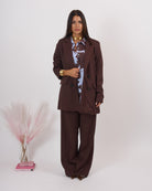 Tailleur doppiopetto composto da giacca modello oversize con interno foderato e spalline, pantalone vita alta con retro elasticizzato e gamba dritta fino al fondo.