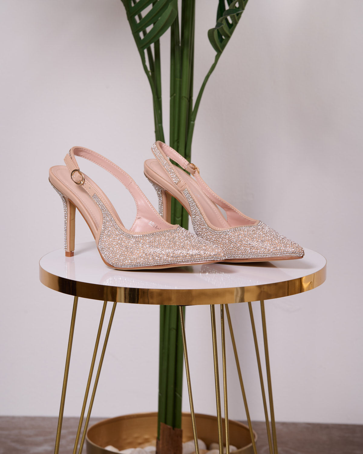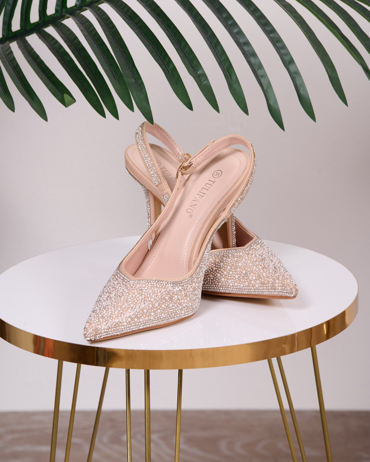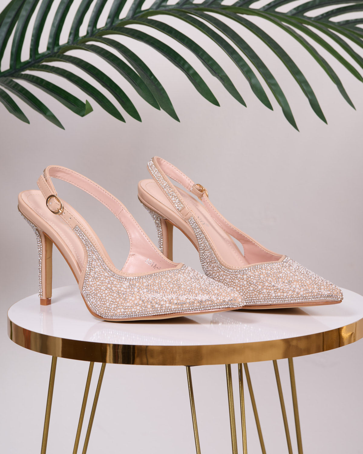 Tomaia in ecopelle rivestite di perline e piccoli strass, cinturino regolabile.