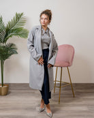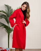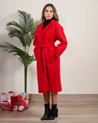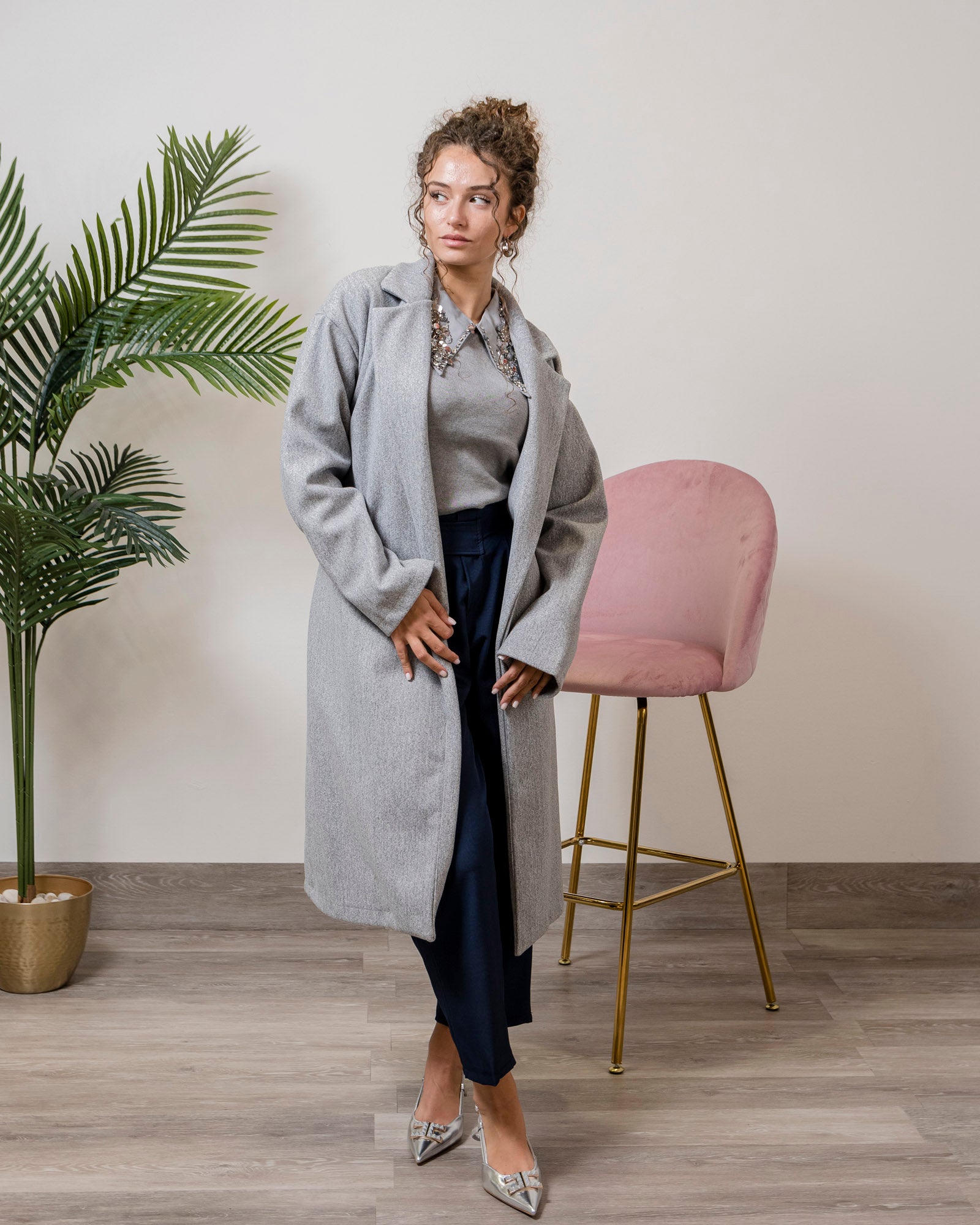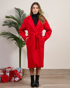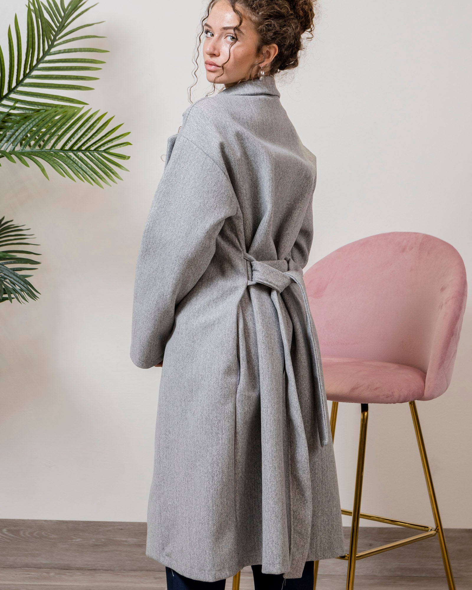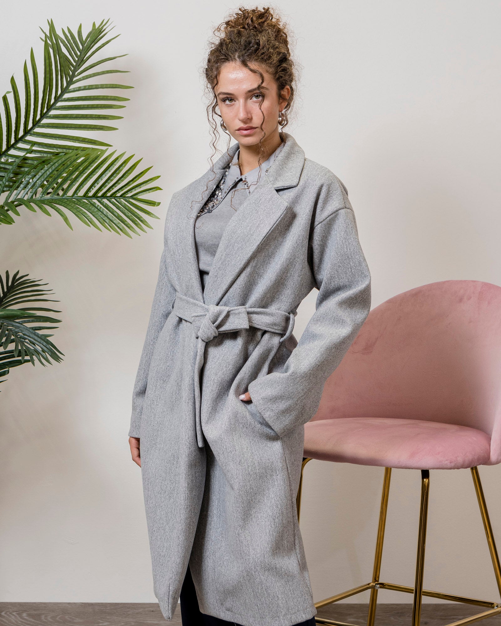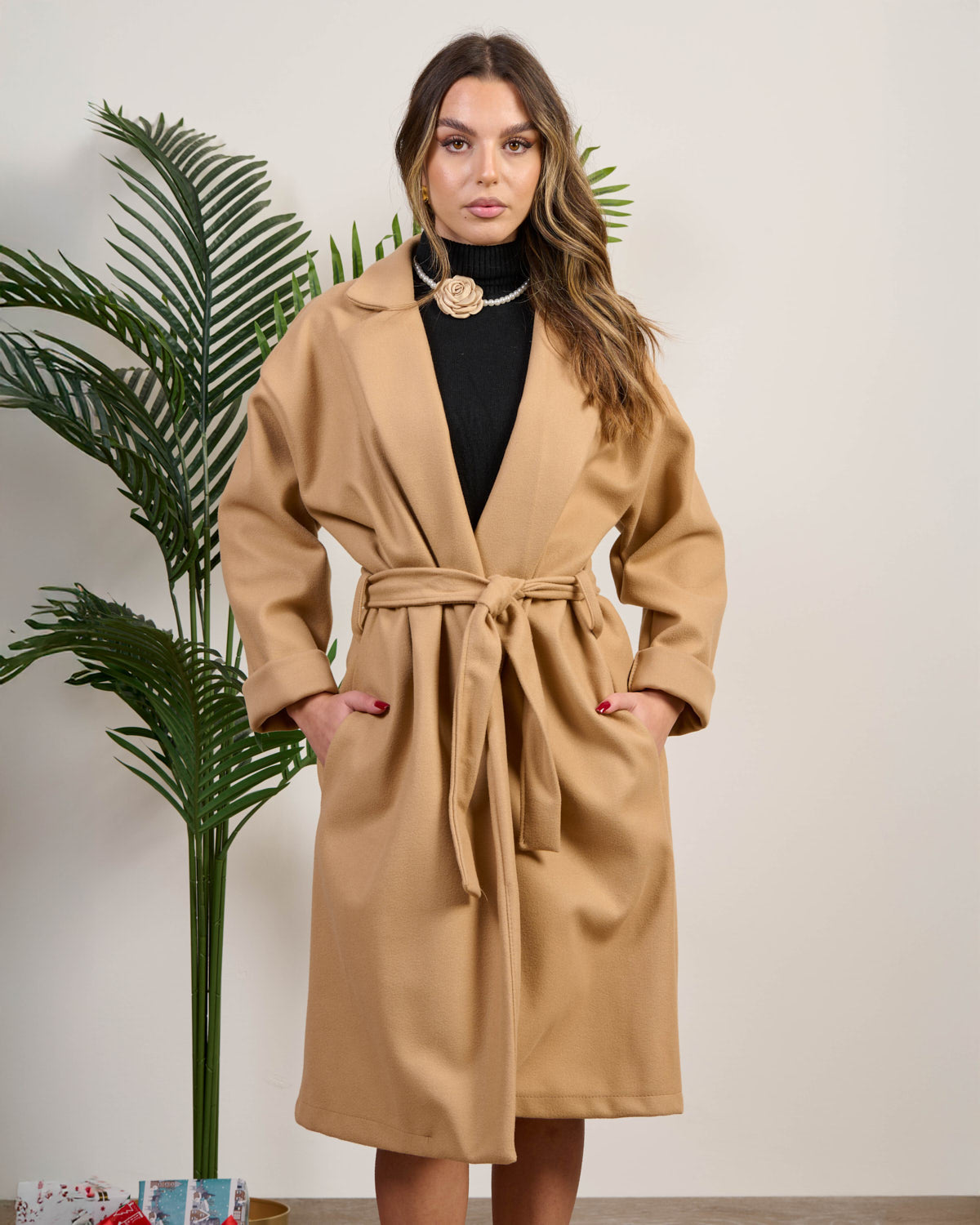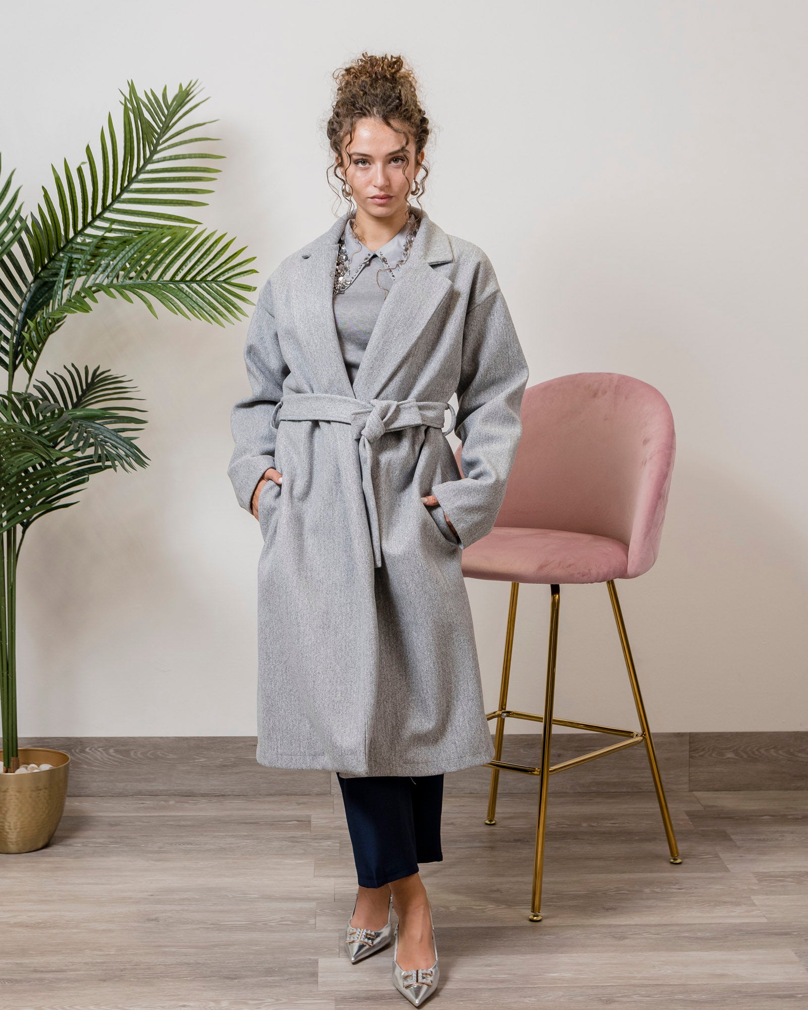 Cappotto in panno con cintura, tasche laterali a filetto. In taglia unica veste fino a L/XL.