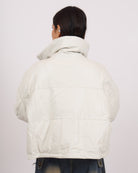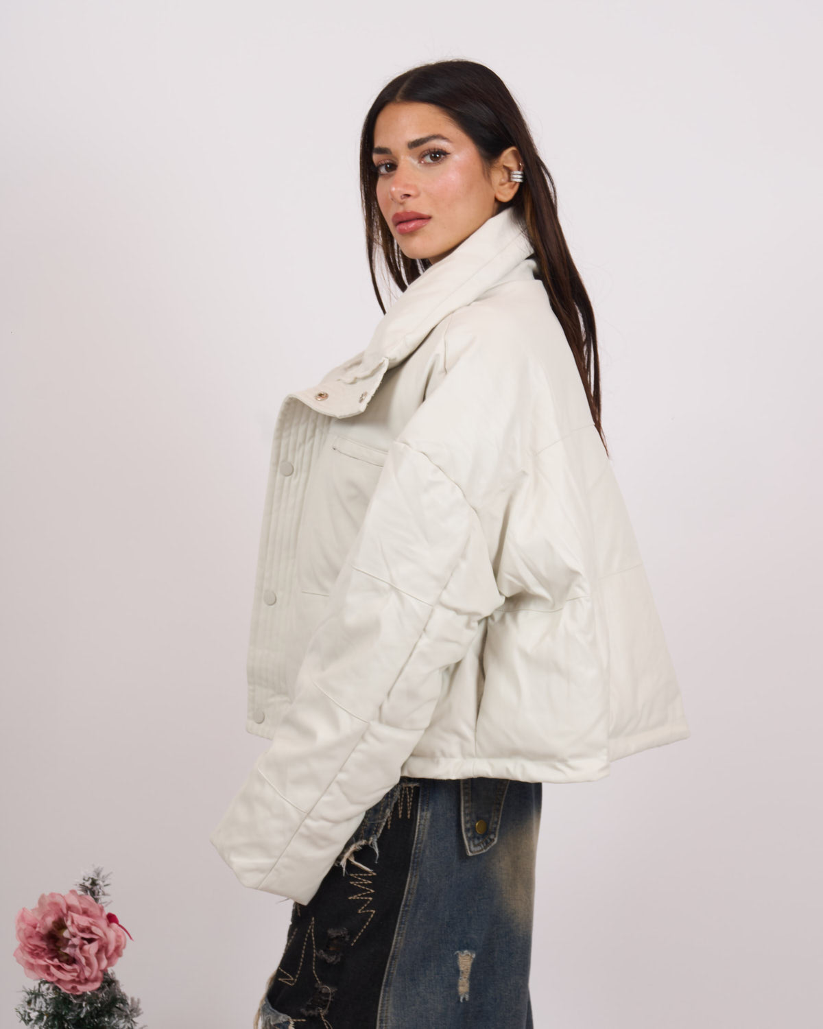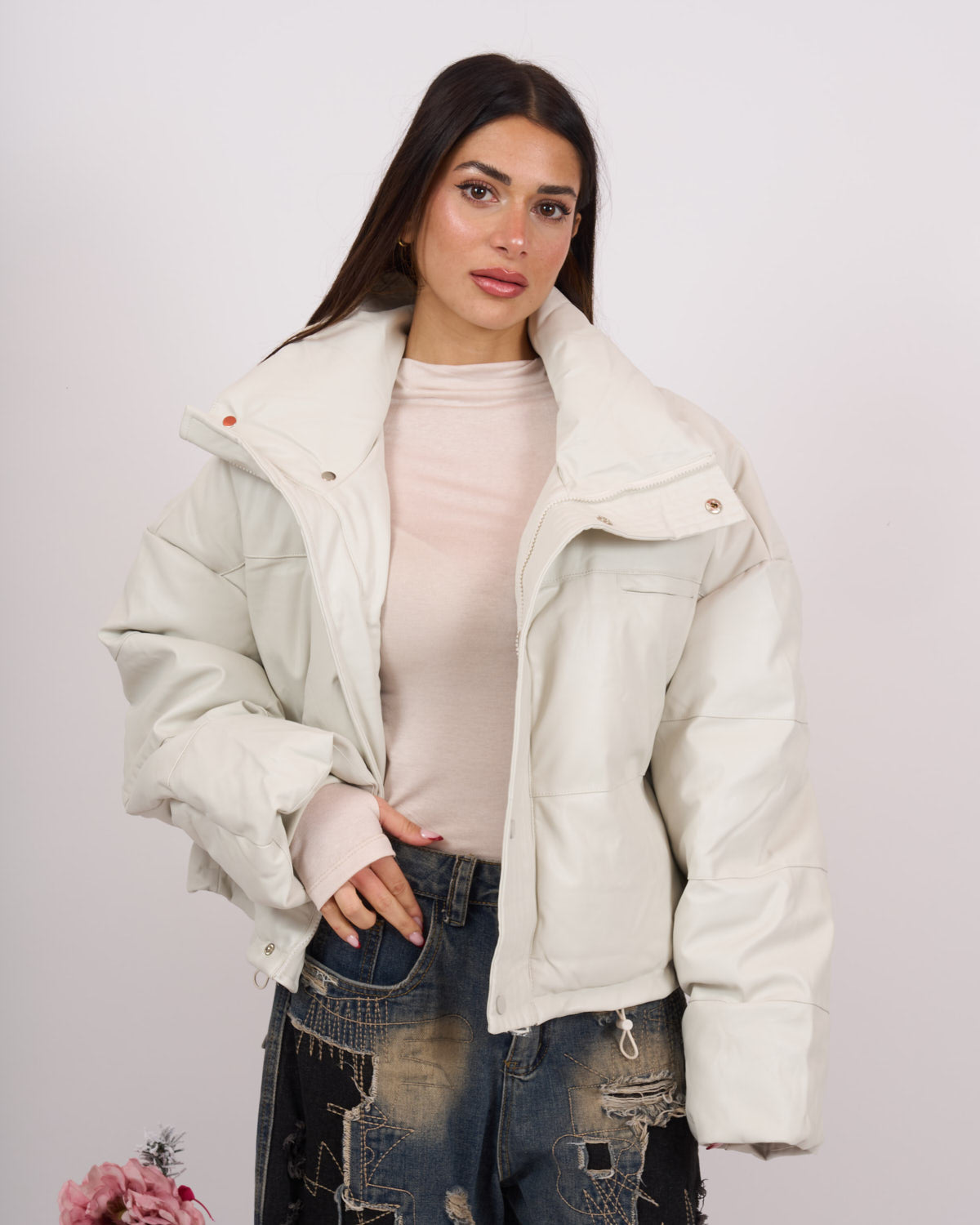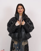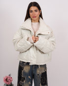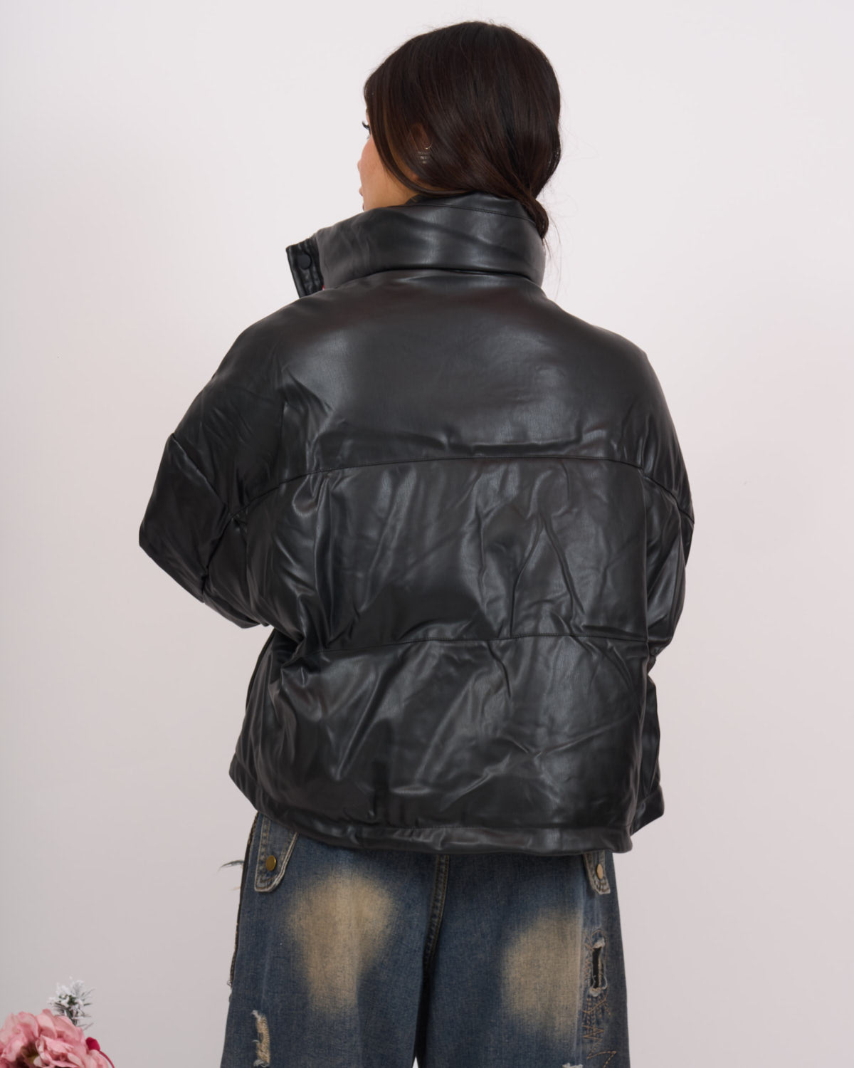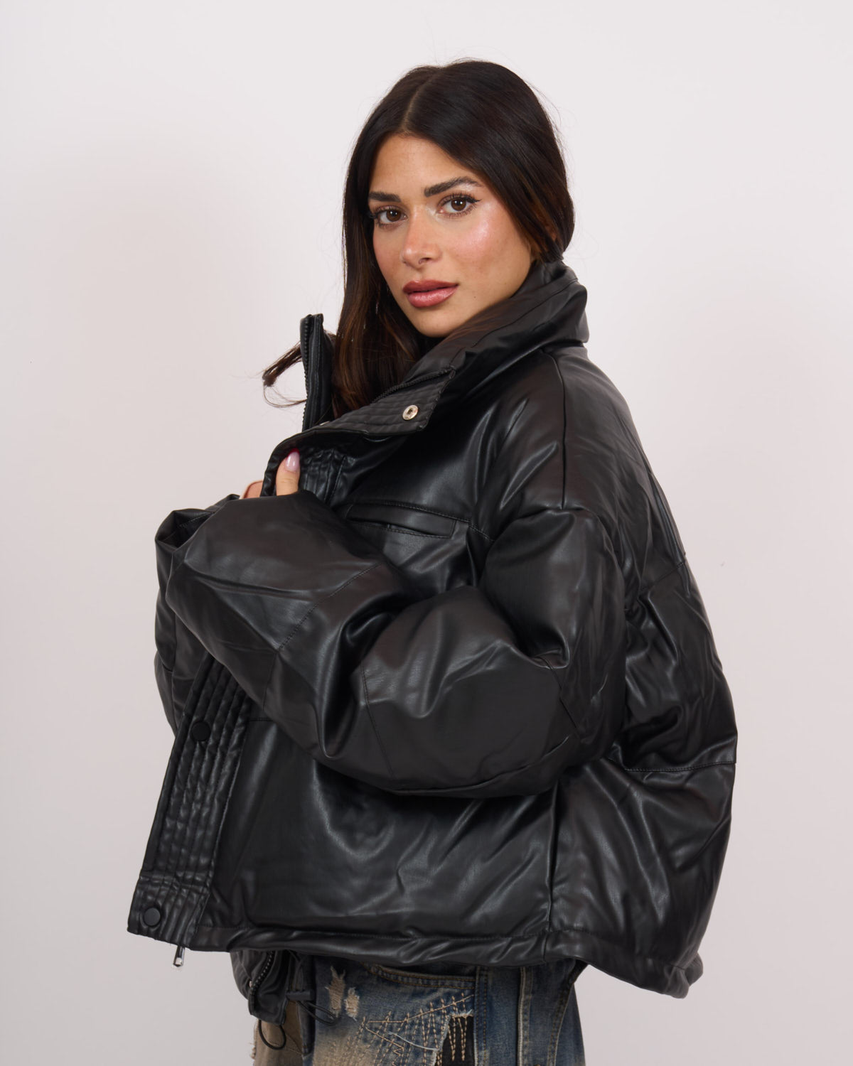 In morbida ecopelle di qualità, imbottito. Modello oversize con chiusura zip in acciaio e tasche laterali. Veste fino a taglia 52.