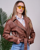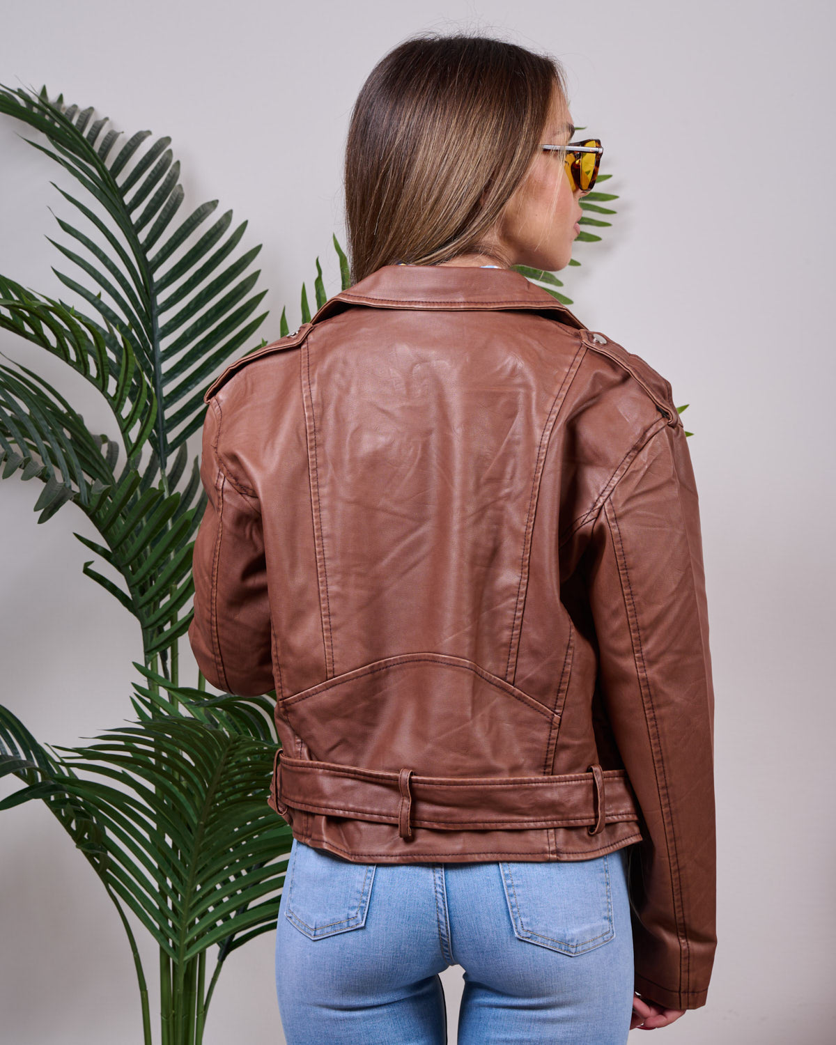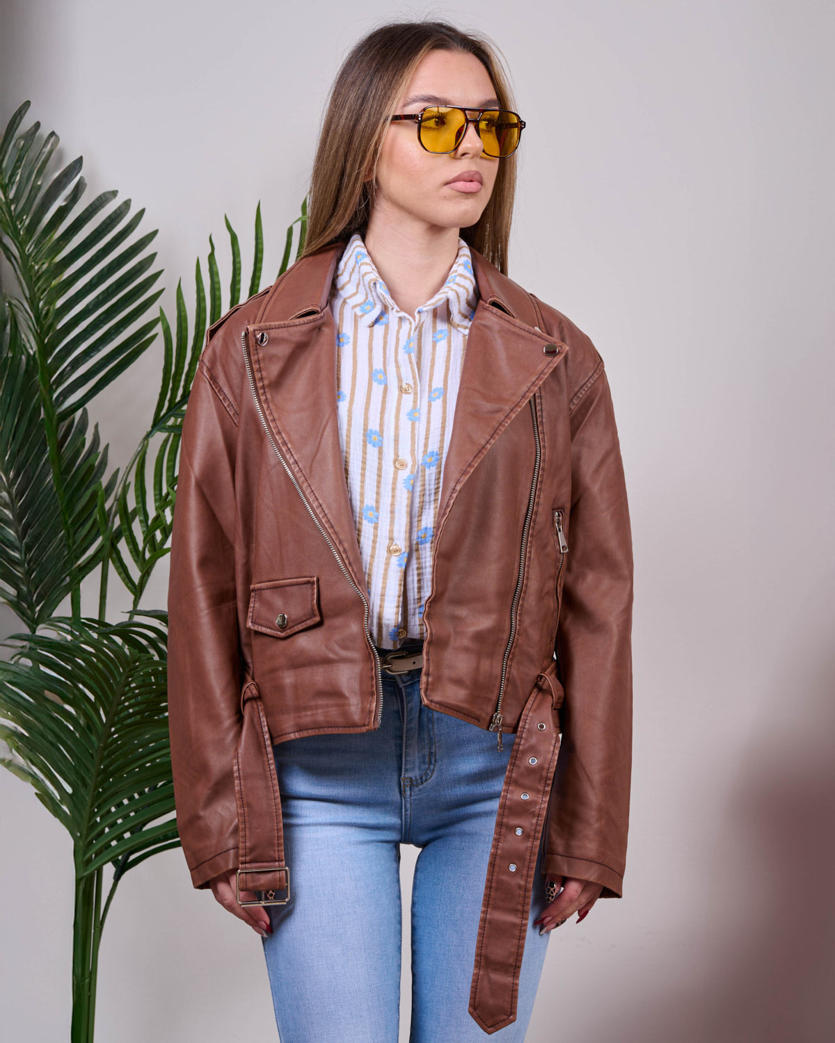 In morbida ecopelle con chiusura zip e stringhe sul bordo in vita.