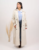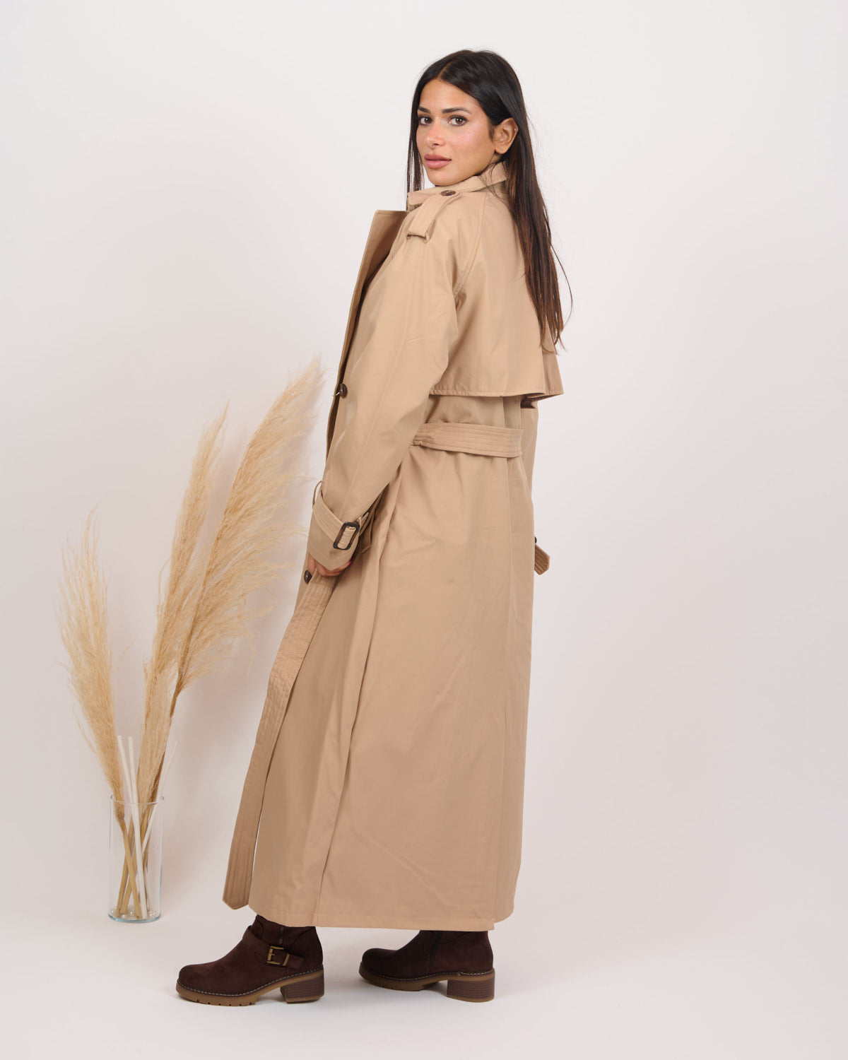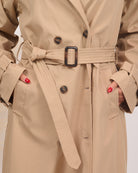 Questo trench lungo, dotato di fusciacca in vita e tasche laterali, presenta un interno doppiato e foderato per garantire comfort e protezione. Perfetto per l’autunno, il tessuto di alta qualità assicura resistenza all’acqua, mantenendoti asciutto in ogni situazione.