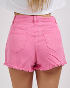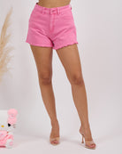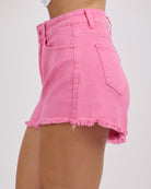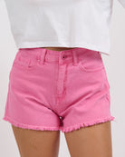 In bull denim lavaggio pink con bordino leggermente sfrangiato sul fondo.