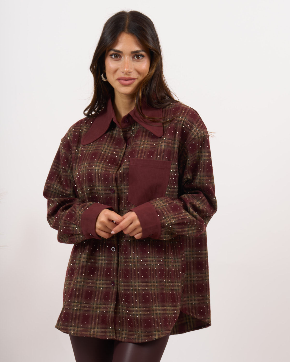 Camicia in tessuto caldo al tatto con brillantini. Vestibilità non aderente veste fino a L/XL.