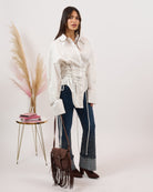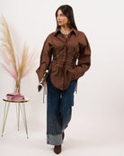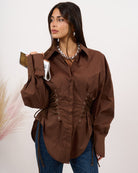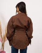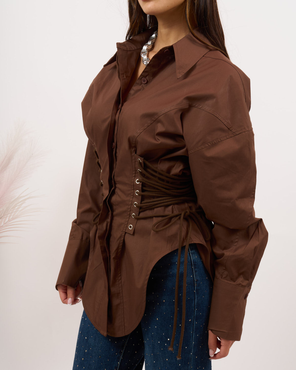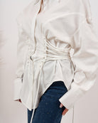 In cotone strutturato, con bustino e stringhe lungo i fianchi regolabili.