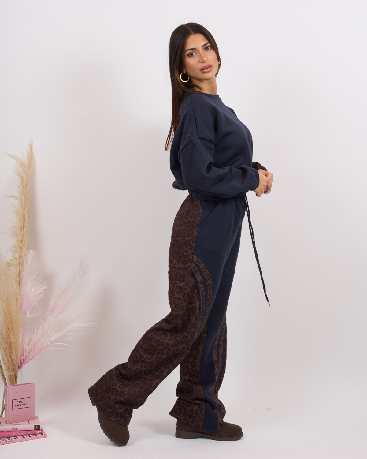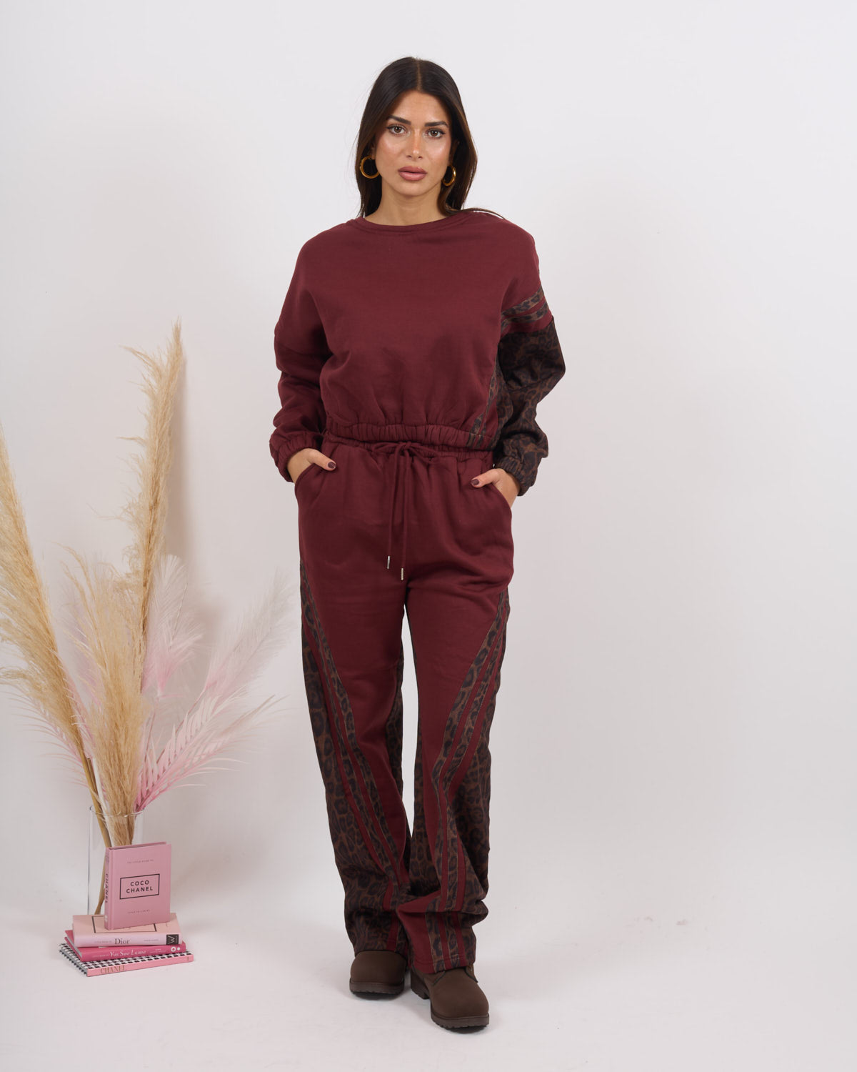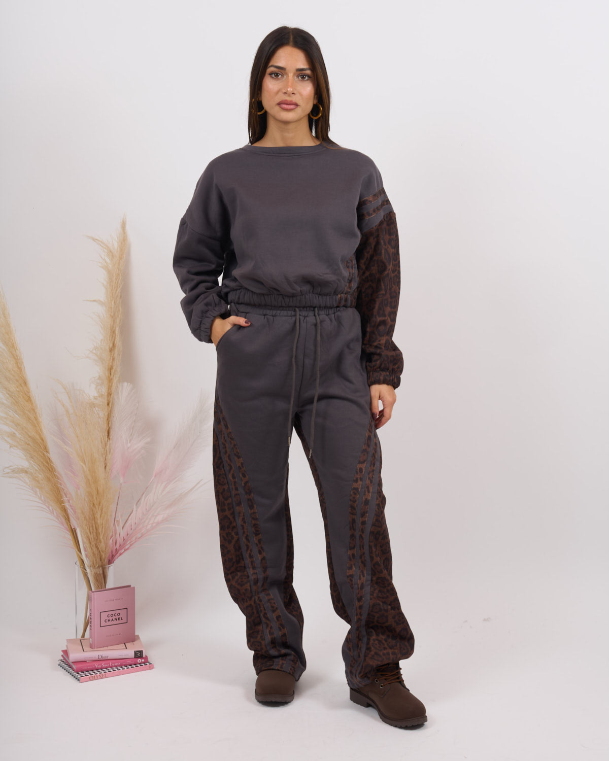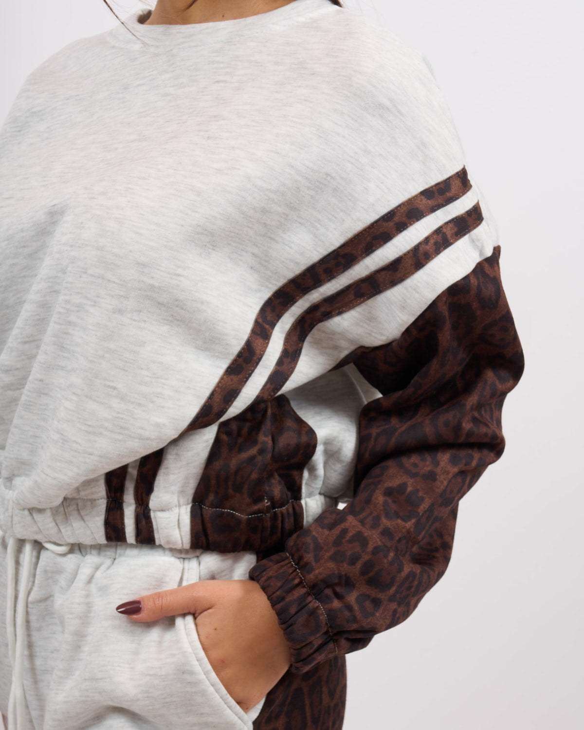 Coordinato composto da felpa leggermente cropped con elastico, pantalone modello balloon alta vita con elastico e lacci, tasche a filetto.