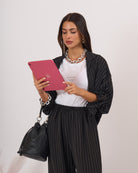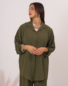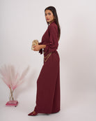 Coordinato composto da camicia/blusa con bottoncini sul davanti e pantalone alta vita elasticizzata. Gamba dritta fino al fondo.