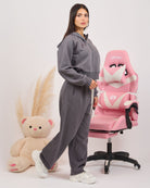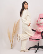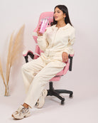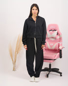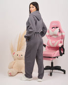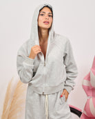 Questo coordinato include una felpa con cappuccio e zip abbinata a un pantalone dal taglio affusolato verso la caviglia, caratterizzato da vita alta elasticizzata con lacci regolabili e pratiche tasche anteriori per comodità quotidiana.