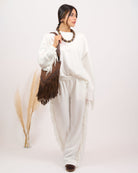 Coordinato composto da maglia girocollo con frange in vestibilitá non aderente con pantalone alta vita elasticizzata con tasche a filetto. In taglia unica, veste fino a taglia 50.