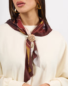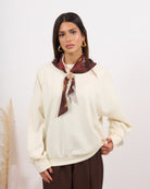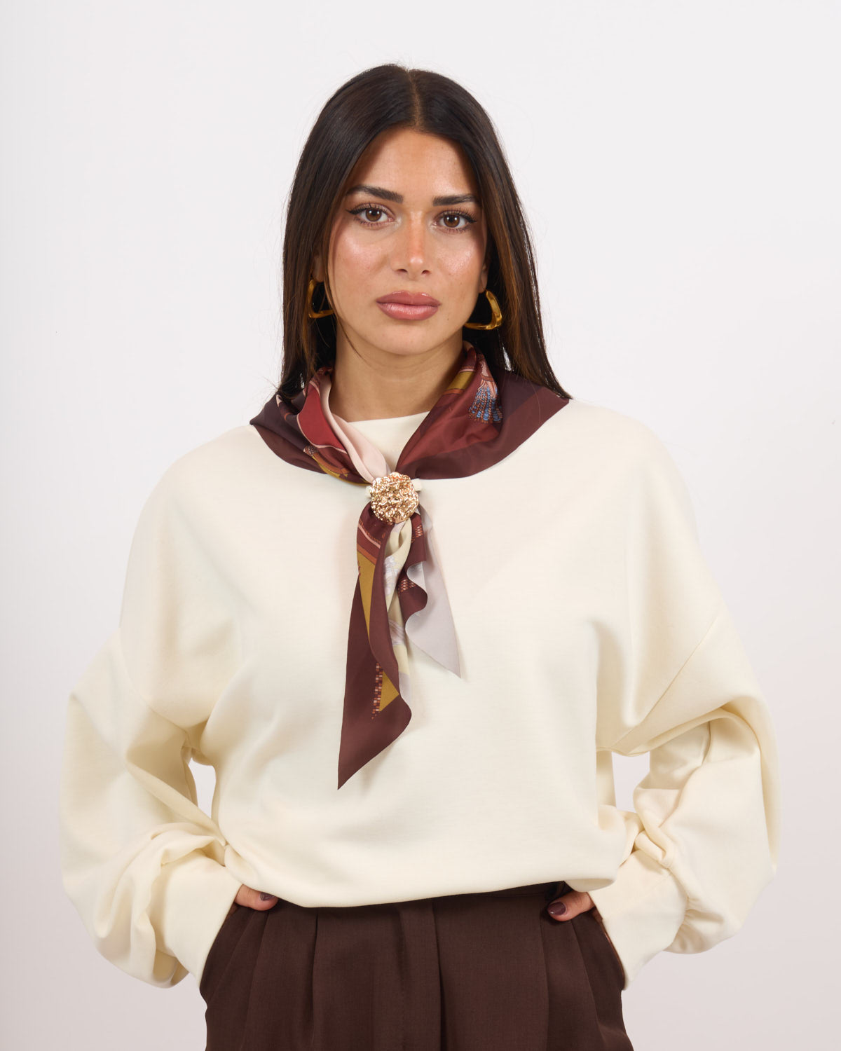 Felpa in viscosa, tessuto liscio e morbido al tatto. Foulard e parte metallica inclusa nella felpa.