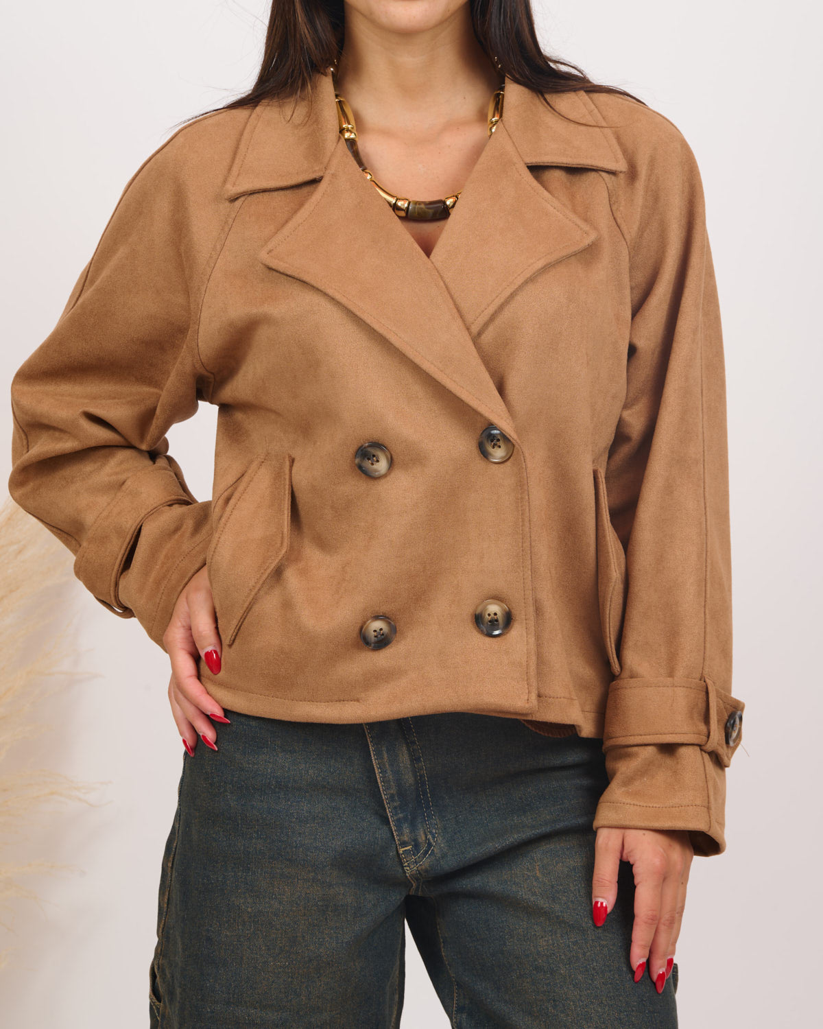 Giacca sfoderato modello chiodo in morbido eco camoscio.