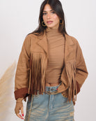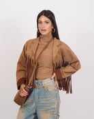 Giacca in eco-camoscio morbido con frange. Interno sfoderato, in taglia unica veste fino a 46/48.
