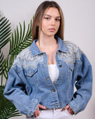 Modello leggermente corto, altezza ombelico. La parte superiore è impreziosita da disegno di tulle e strass cucito sia anteriormente che posteriormente.