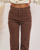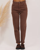 Denim elasticizzato modello mom fit lavaggio marrone, alta vita.