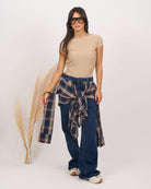 Jeans con finta camicia annodata, alta vita con gamba dritta fino al fondo.