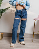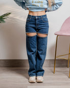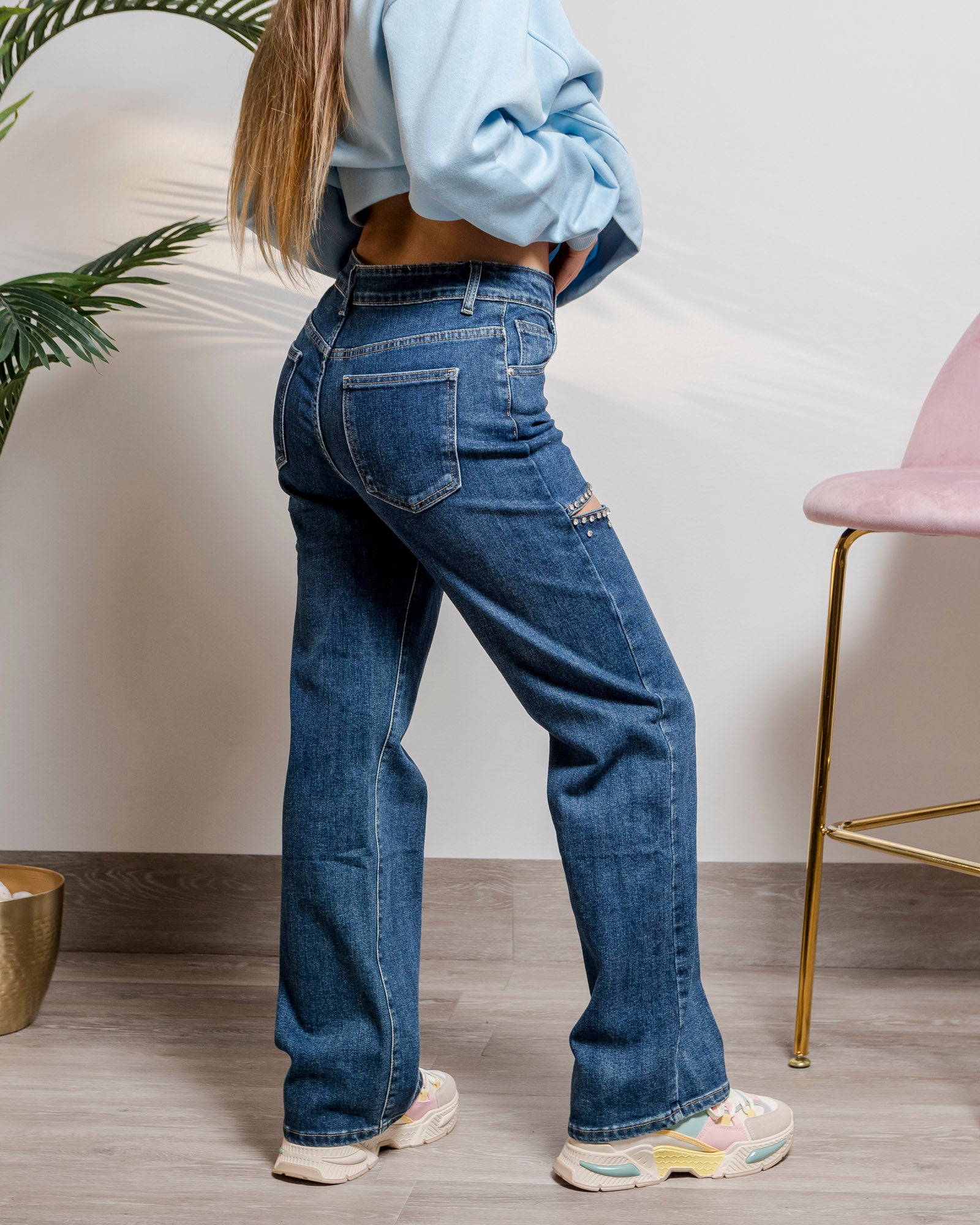 Denim con spacchi sul davanti con strass, gamba dritta fino al fondo e alta vita.
