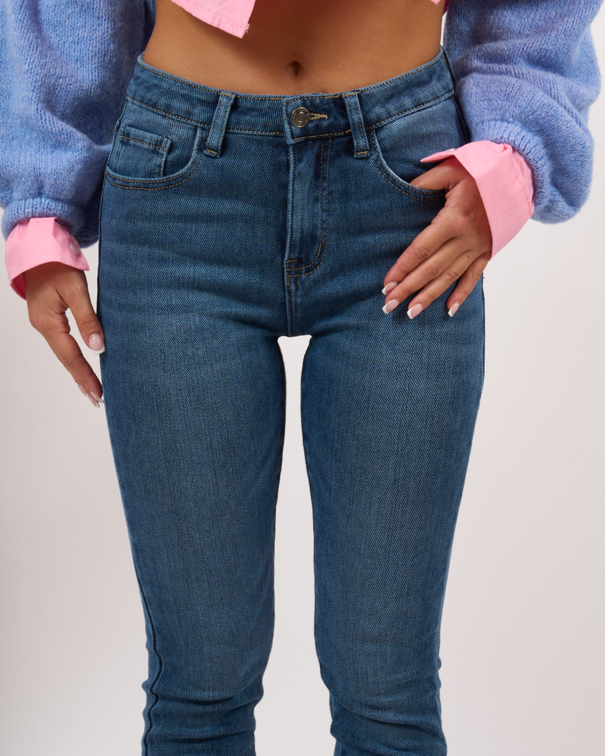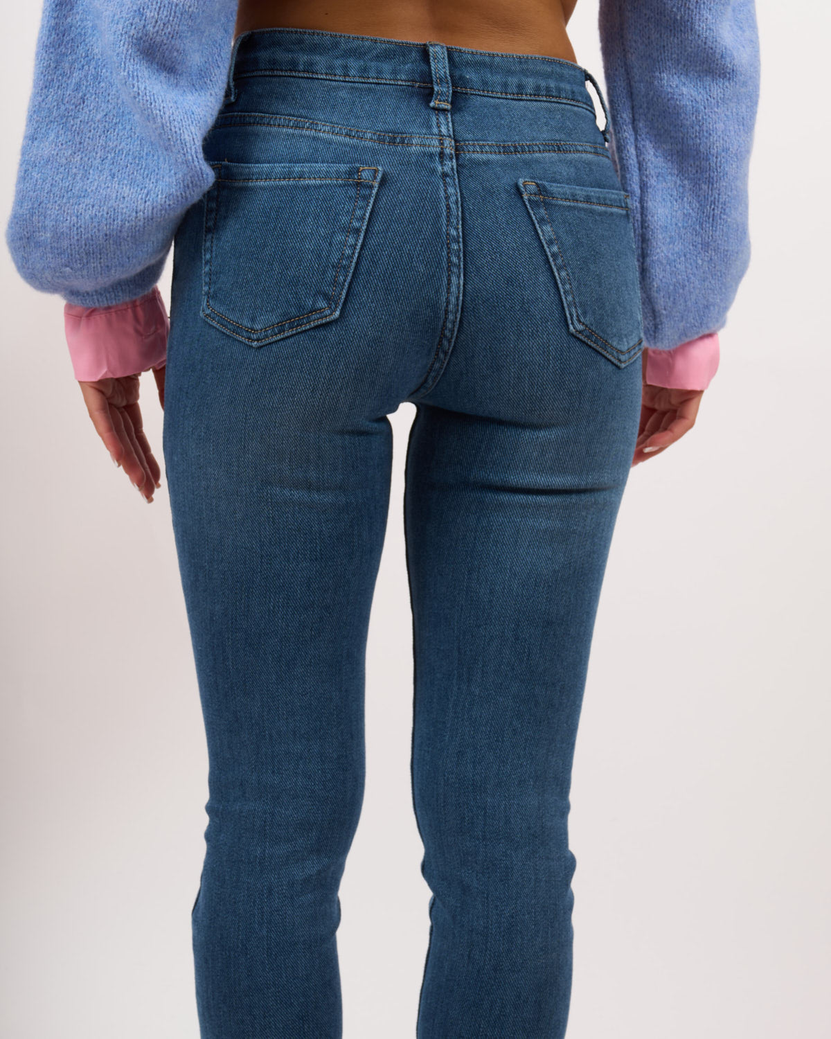 Denim elasticizzato con vita medio/alta. Liscio e morbido al tatto, vestibilità aderente.